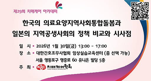 (사)치매케어학회는 지난 1월 30일 대한간호조무사협회 임상실습교육센터에서 ‘한국의 의료요양지역사회통합돌봄과 일본의 지역공생사회의 정책 비교와 시사점’을 주제로, 제29회 치매케어 아카데미를 개최했다.