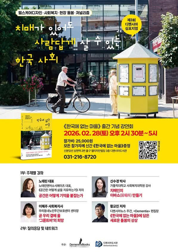 디멘시아북스의 신간 『한국에 없는 마을』 출간을 기념한 심포지엄이 디멘시아 도서관에서 개최됐다. 이번 심포지엄은 ‘치매가 있어도 사람답게 살 수 있는 한국사회’를 주제로, 다양한 분야 전문가들이 참여해 치매 돌봄의 방향성과 가능성을 논의하는 자리로 마련됐다.