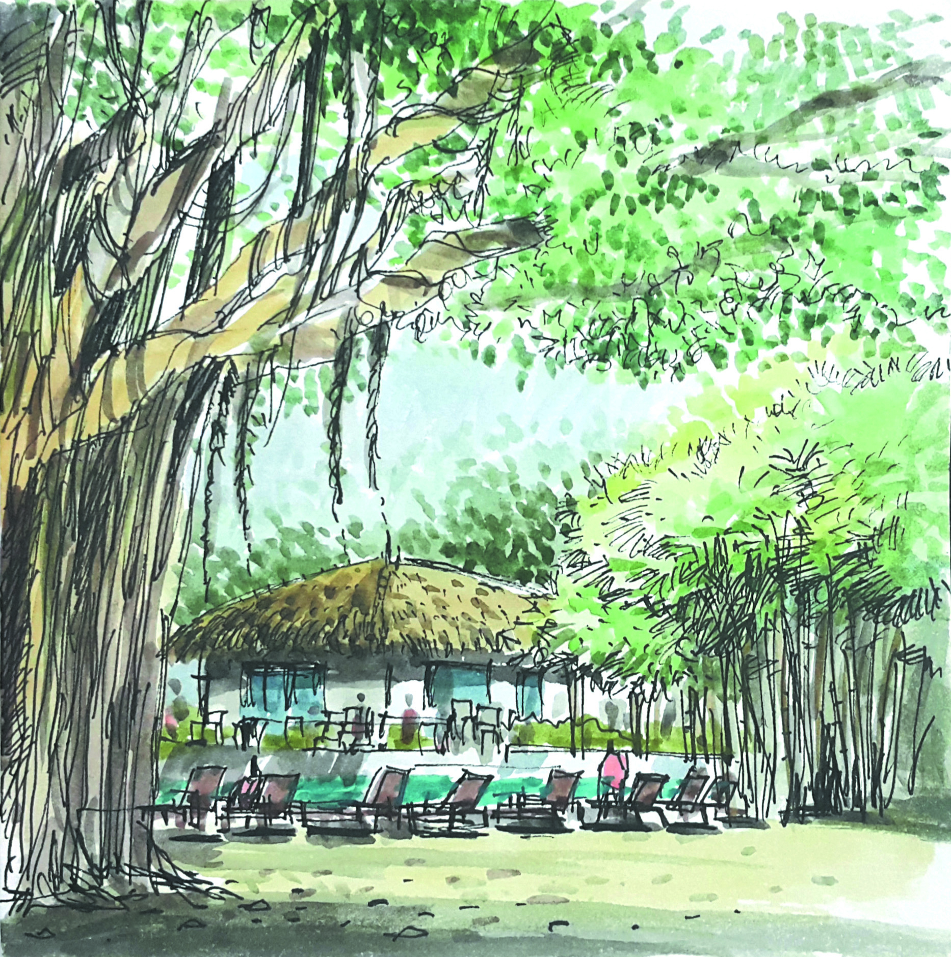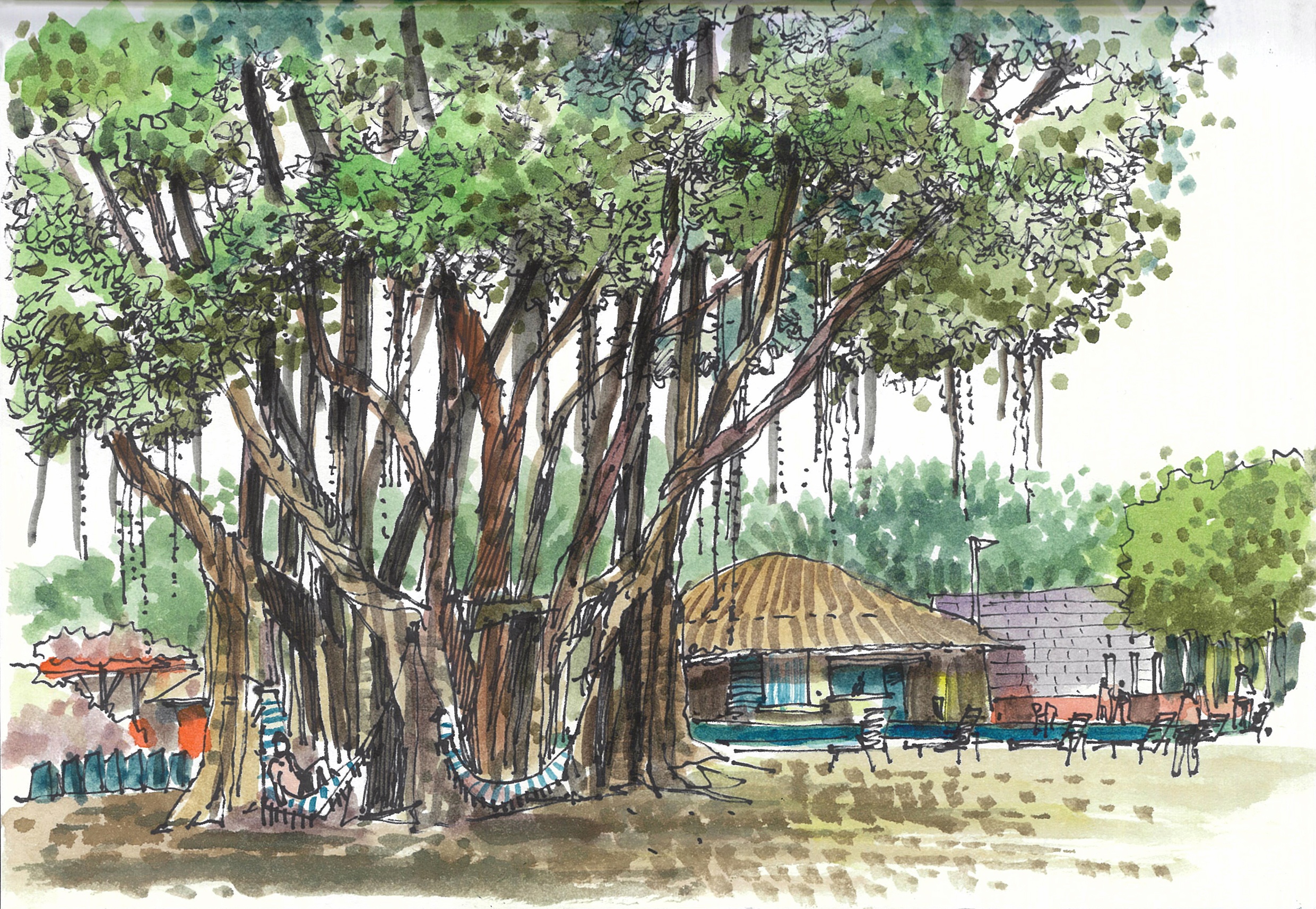 11. 반야트리(1) 이 나무의 특징은 가지에서 땅으로 내려와 뿌리가 되는 기근이다. 세월이 흐르면서 이 기근들이 굵어져 마치 여러 개의 줄기가 나무를 지탱하고 있는 것 같은 장엄한 실루엣을 만들어 낸다. 주로 아열대 및 열대 지방에서 흔히 볼 수 있는데, 거대한 그늘을 만들어 내어 예로부터 마을의 쉼터나 신성한 장소로 여겨졌다고 한다. 자세히 관찰해보면 뒤엉킨 줄기와 뿌리가 만들어내는 수직적 선들이 매우 복잡하면서도 역동적인 구조미를 보여준다. 나무에 '해먹'을 걸어 휴식 공간으로 활용하기에 아주 완벽한 형태를 갖추고 있다. 그래서인지 휴양지 특유의 평화롭고 자연 친화적인 분위기를 잘 보여주고 있다. 저 나무 아래 해먹에 누워 있으면 거대한 자연 구조물 안에 들어와 있는 듯한 아늑한 기분이 든다.