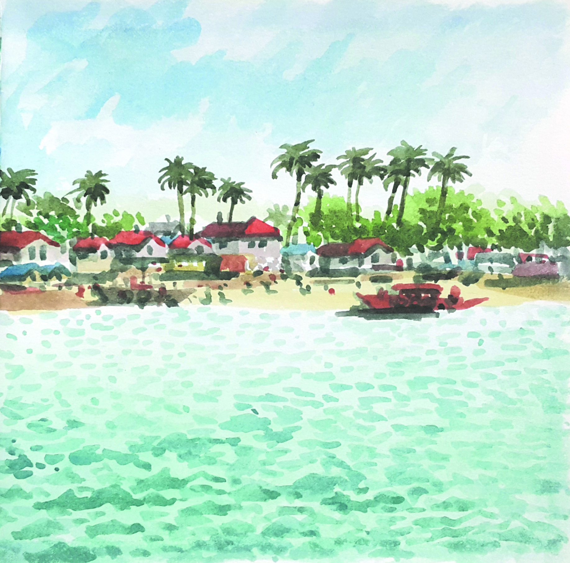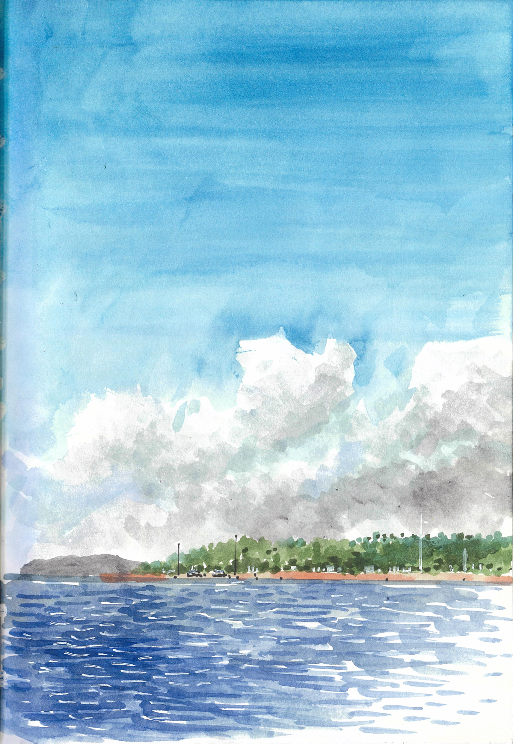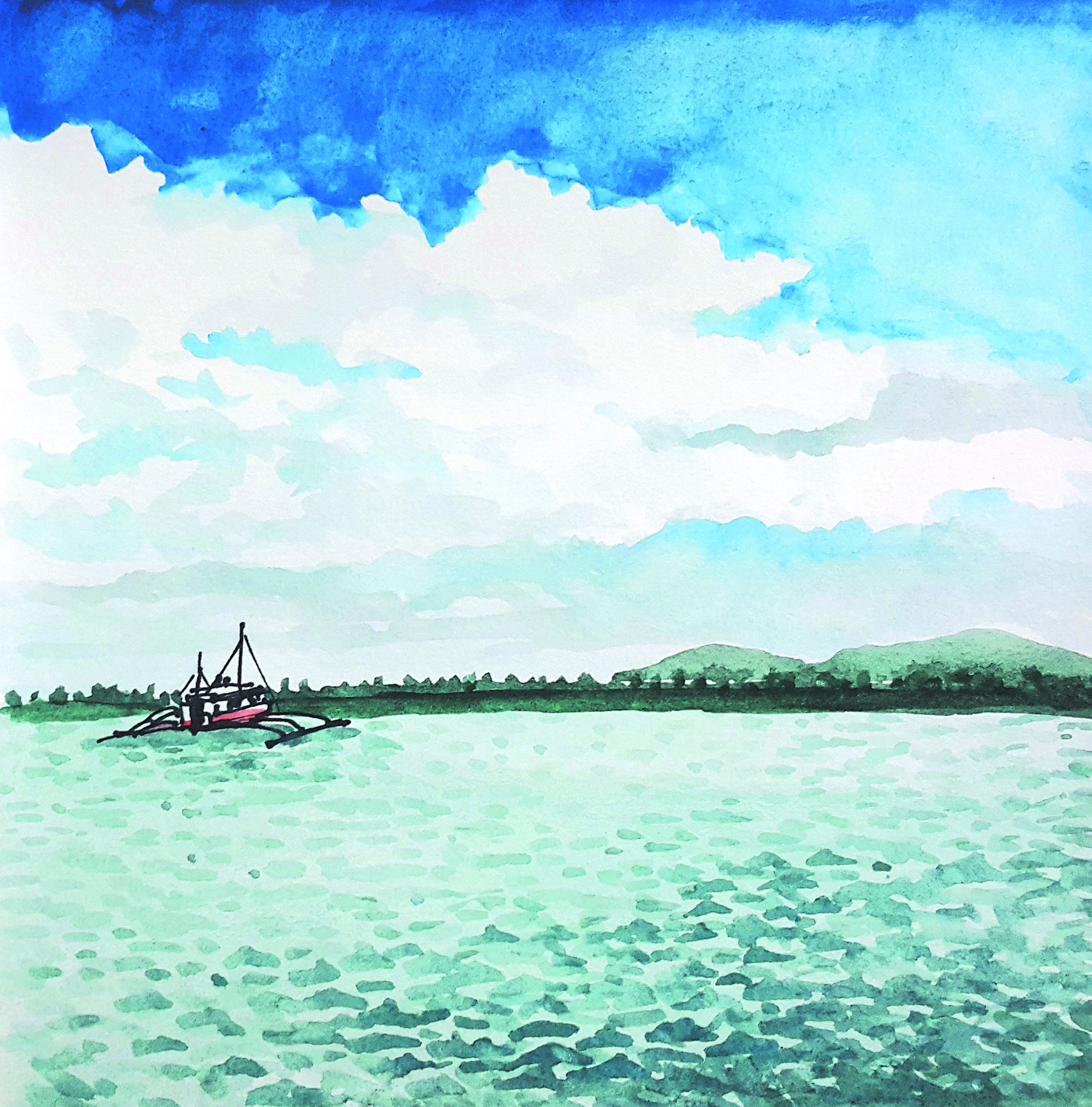 9. 블루워터 마리바고 호텔 이 곳은 시내와 멀지 않지만 시간이 정지된 듯 모든 풍경이 한가롭고 여유롭다. 호텔 주변의 프라이빗 해변을 산책하다가 수상 카페에서 맥주 한 잔을 주문한다. 전망이 좋은 한적한 구석에 자리를 잡고 휴대한 스케치북에 바다 풍경을 그리던 나를 신기하게 구경하던 원주민 아이들의 순진무구한 눈망울이 눈에 선하다. 먼 바다위에 하늘의 구름과 바다 물결 사이로 유유자적하는 조각배는 그동안 분주하게 살아온 내게 근원적 질문을 던진다. 늘 문명과 원시 자연의 경계에 서면 생각이 깊어진다.
