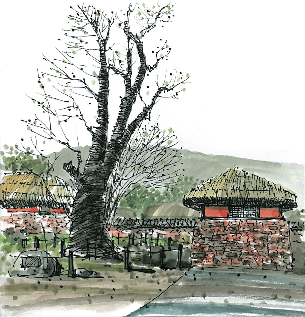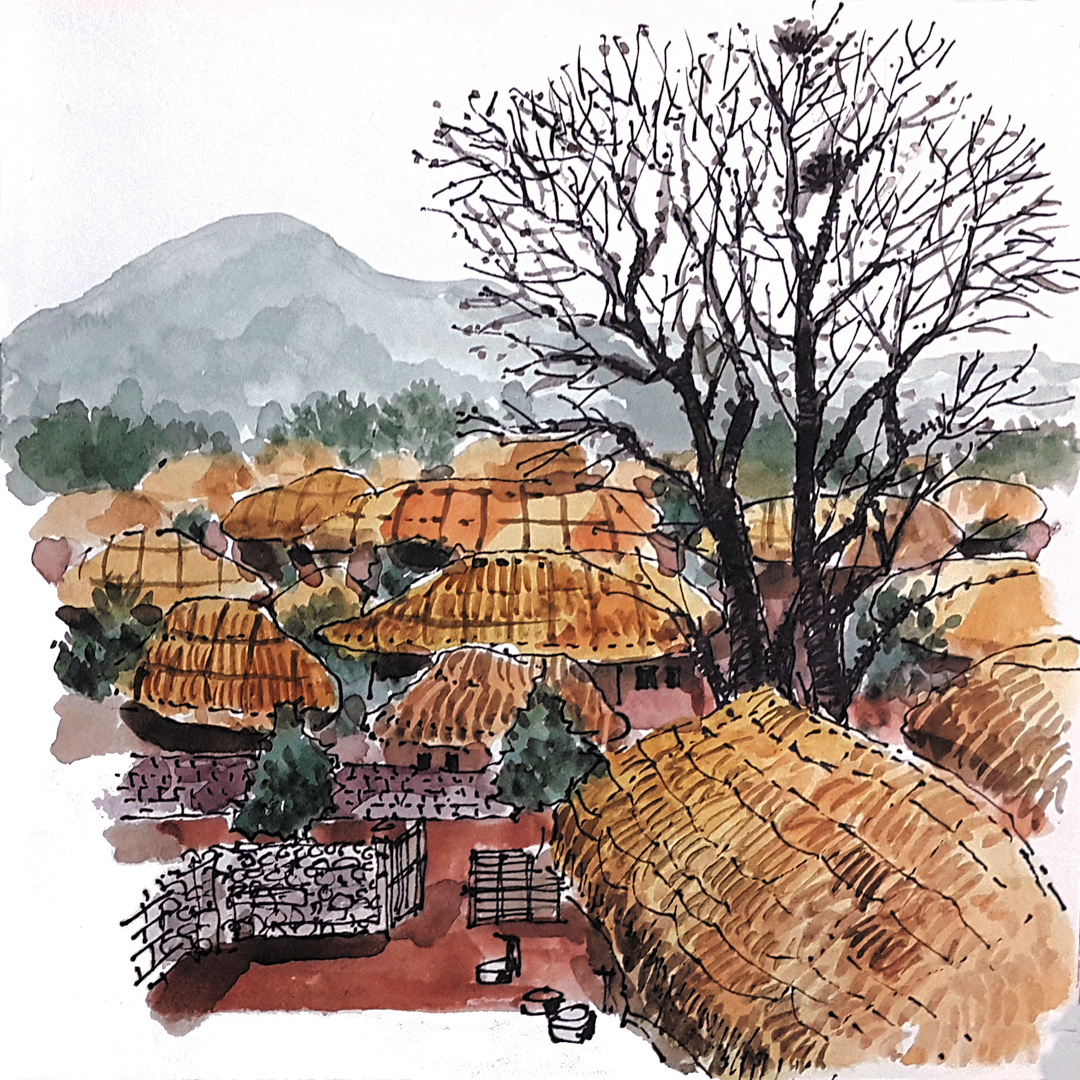 관광지에서 전시용으로 박제된 초가집은 흔하지만 실제 삶을 일구고 있는 초가집과 그 집들로 구성된 마을은 현실적으로 찾아보기 어려운데 100세대 가까운 가구가 모여 생활하고 있다니 반가운 마음이다. 동측 입구인 낙풍루로 진입하여 성곽 위로 올라 한 바퀴 산책을 시작한다. 높은 위치에서의 산책은 잔잔한 봄바람과 함께 시선은 멀리 확장된다. 성곽의 가장 높은 곳에 다다라서 뒤돌아보면 크고 작은 초가들이 옹기종기 머리를 부비며 정답게 모여 있는 형상이 우리 전통건축의 특징인 군집의 미학을 떠올리게 한다. 마을의 배경에는 높은 금전산이 병풍처럼 감싸고 동화 속 마을처럼 고즈넉하고 평화롭다. 산책 후 마을 주점에 들러 동동주와 파전을 빼놓을 수 없다. 도토리묵도 빠지면 서운하다. 출출한데 일행과 주거니 받거니 하다가 보니 취기가 오른다. 봄바람에 실려오는 온기에서 어디엔가 봄기운이 성곽마을을 소리 없이 점령하고 있음을 느낄 수 있다. 홍매화는 벌써 취했는지 얼굴이 붉게 상기되어있다.