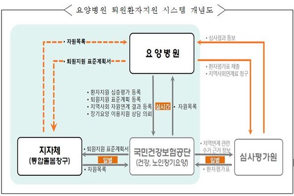 국민건강보험공단은 이러한 문제를 해결하고 요양병원 입원환자의 퇴원 후 지역사회 자원 연계 업무를 효율화하기 위해 공단 요양기관 정보마당(medicare.nhis.or.kr/portal/index.do)에 해당 시스템을 구축하고 ‘통합돌봄 선도 사업’을 시작했다. 또한 요양병원 퇴원이 예정된 장기요양수급자도 동일한 시스템을 통해 지자체 및 노인장기요양보험 운영센터와의 연계를 통해 상담을 받을 수 있게 되었다.