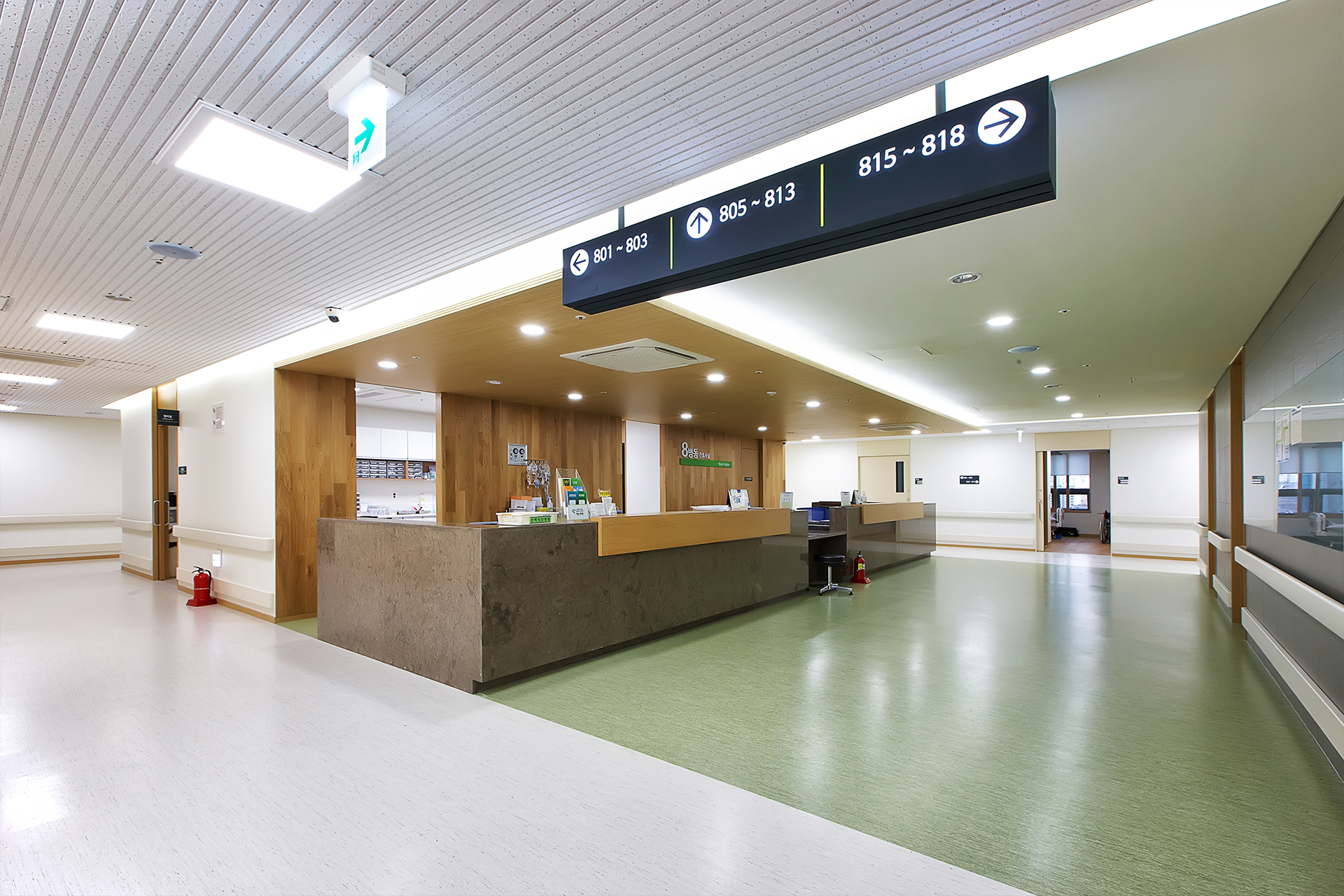 우리 병원은 복도가 넓습니다. 복도를 넓게 한 이유는 정형외과 환자들 대부분 누워 있어서 많이 움직이고 돌아다닐 수 있도록 계획한 것입니다. 특히 타 병원에 비해 복도를 3m로 넓혔습니다. 또한 병실의 경우 각 병실 간의 흡배기 분리 시스템과 간호·간병통합서비스로 감염으로부터 안전한 입원 환경을 조성했습니다. 정형외과 병원 특성상 수술을 진행해야 하는 경우가 많습니다. 최첨단 의료장비로 수술을 잘 끝냈다 하더라도 감염이 발생한다면 아무 소용없습니다. 따라서 감염 예방을 위해 치료공간에도 중점을 뒀습니다. 수술실 역시 수술 중 감염방지를 목적으로 한 고도의 무균환경으로 공간을 설계했습니다. 최적의 환경을 유지하기 위해 실내의 온도, 습도, 조도, 압력 기류의 분포와 속도 등을 일정 범위 내로 제어하는 FAN FILTERUNIT(F.F.U)방식으로 수술을 시행하고 있습니다.