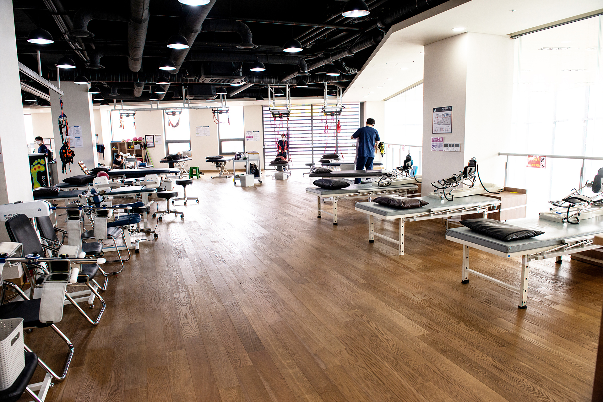 물리치료센터의 공간을 상대적으로 넓게 잡고 벽을 없앴습니다. 특히 통유리 채광을 통하여 밝게 만들었습니다. 수술 후 많은 환자들이 물리치료센터에서 치료받는 것을 고려한 것입니다. 운동치료 및 작업치료는 같이 하면서 서로에게 동기 부여를 할 수 있도록 했고, 단순 물리치료는 독립적인 공간을 확보하여 편안한 상태를 유지하도록 했습니다.