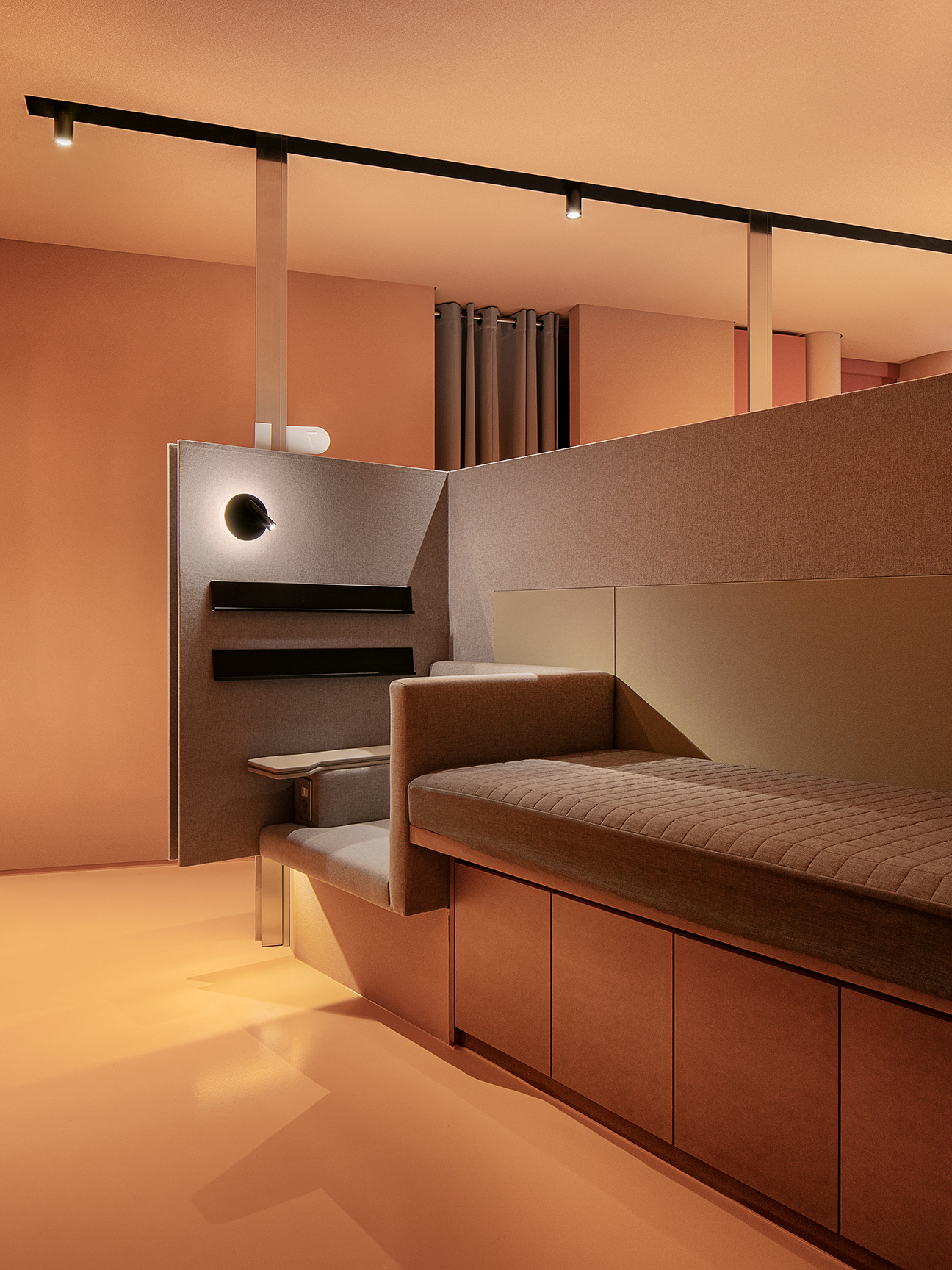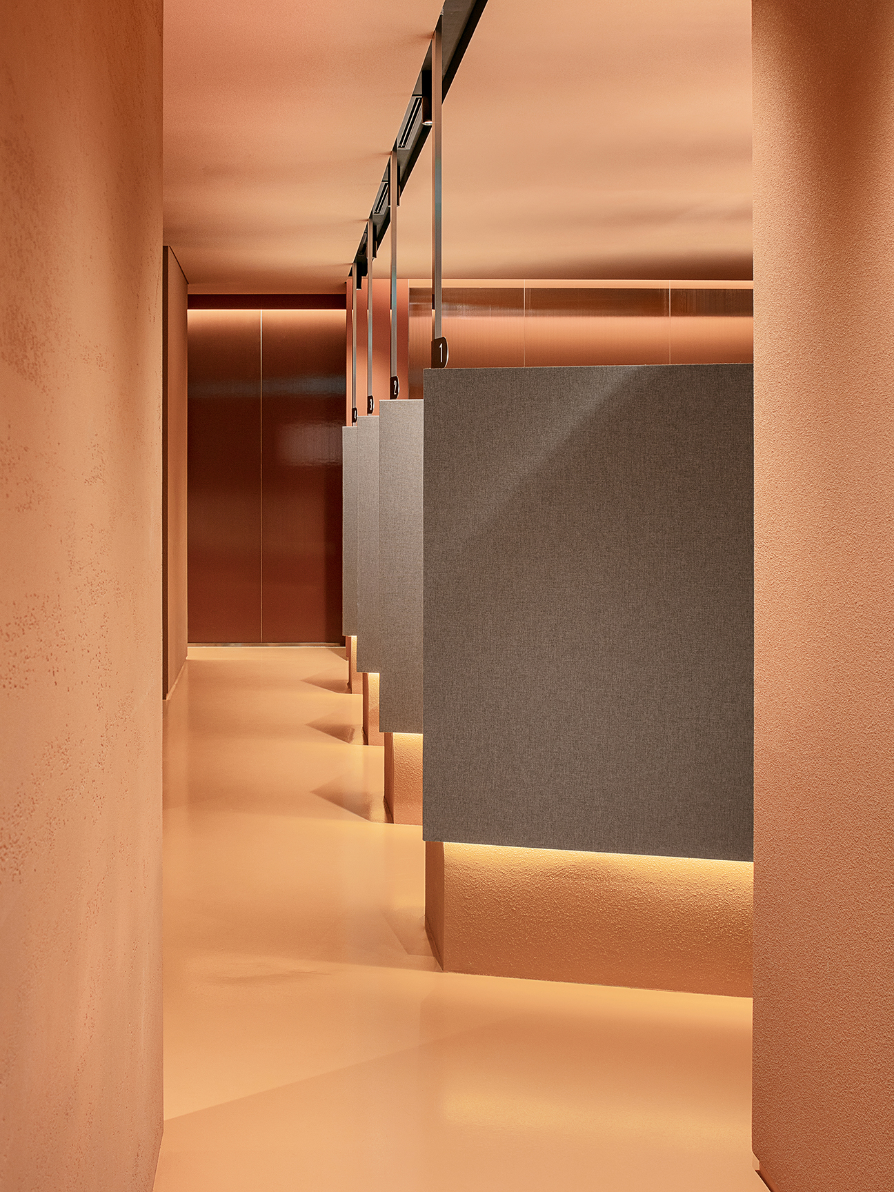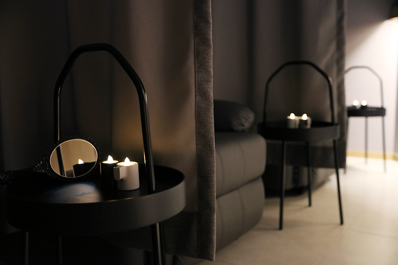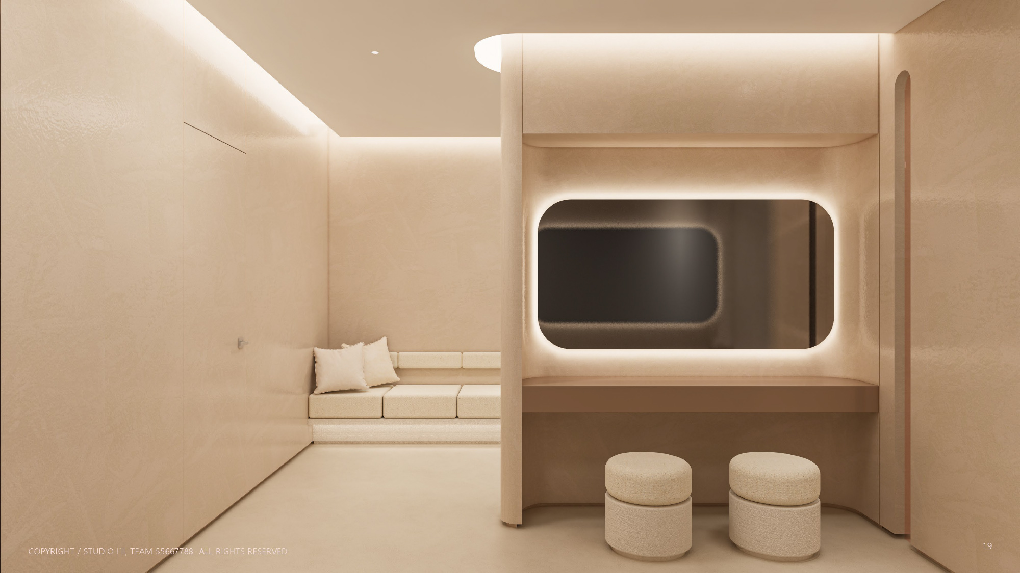 3호점, 에스테틱(피부관리실)은 ‘비행기 1등석’ 컨셉으로 설계되었습니다. 장시간 누워 있어야 하는 환자분들이 편안하게 쉴 수 있는 프라이빗 공간을 최우선으로 고려했습니다. 기존 커튼 방식이 아닌 각 배드를 개별 칸막이로 나누고 오픈 대각선 배치를 적용하여 환자가 완전히 휴식하며 피부 관리를 받을 수 있도록 했습니다. ‘Medical Spa Resort’를 기준으로 의료와 휴양을 결합한 공간으로, 스마트룩스 레이저 전용 공간, 고압산소챔버, 두피 클렌징 케어 공간, 1:1 맞춤 개인 관리실 등 호텔 스파 수준의 경험을 제공하며, 전용 샤워실과 파우더룸, 사후관리 환자 전용 휴게 공간을 마련하여 편안함과 프라이버시를 동시에 확보했습니다.
