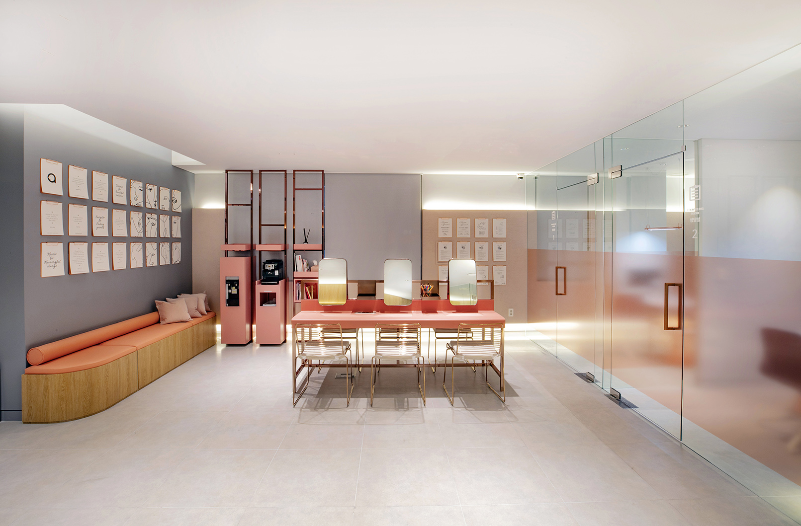 메이크업 컬러링을 할 수 있는 라운지 테이블 11. 1호점에서 4호점까지의 진행 과정 중 원장님께서 디자이너에게 특별히 요구하셨던 부분이나 가장 중요하게 생각하신 공간은 어디인지 궁금합니다.