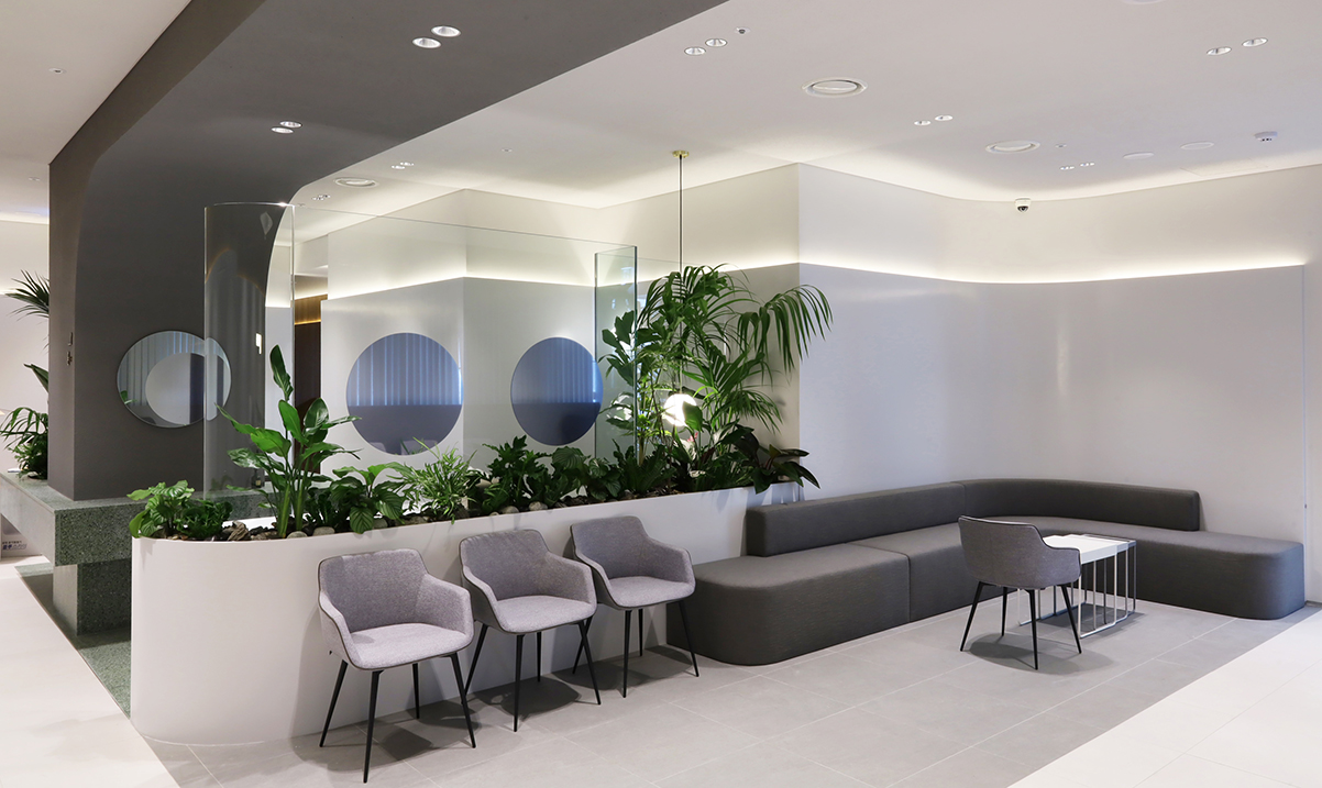 1호점인 글로벌 뷰티센터(수술센터)는 ‘Cave Temple’, 즉 동굴 사원 컨셉으로 설계되어 치유와 재생을 중심으로 공간을 구성하였습니다. 총 8개의 수술실과 4개의 처치실을 갖추고 CCTV를 설치하여 투명성을 확보했으며, 응급 시스템도 완비하였습니다. 자연 채광을 활용한 회복실과 힐링 공간으로 설계된 대기 공간은 환자분들의 편안함을 극대화하며, VIP룸을 별도로 운영해 프라이버시를 중시하는 환자 요구도 충족시켰습니다. 특히 해외 환자분들이 많이 방문하기 때문에 휴양지에 온 듯한 느낌을 주고자 했으며, 공간 곳곳에 뷰티 스팟을 마련하고 핸드 샤워 공간과 라이브러리를 배치하여 한국의 뷰티 문화를 체험할 수 있도록 했습니다. 전체 톤은 회색과 올리브 그린을 기반으로 식물을 배치해 편안함과 안정감을 주는 공간으로 설계했습니다.