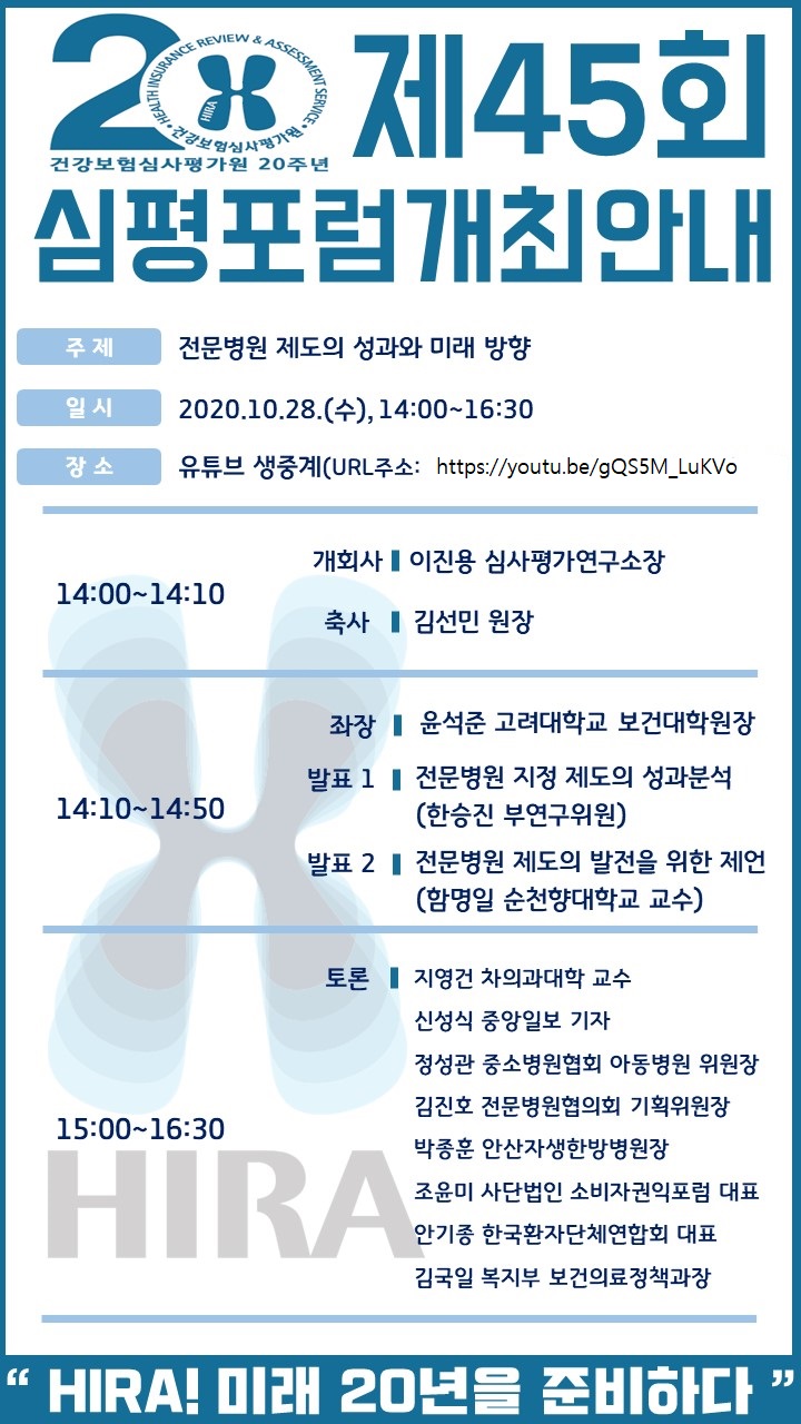건강보험심사평가원은 지난 2020년 10월 28일 ‘전문병원 제도의 성과와 미래 방향’을 주제로 「제 45회 심평포럼」을 개최했다. 건강보험심사평가원 20주년을 맞이하여 열린 이번 포럼에서는 그간 전문병원 제도의 운영성과를 공유하고, 올해 제 4기 전문병원 지정에 앞서 전문병원의 의료전달체계 내 역할 강화를 위한 발전방향을 모색했다.