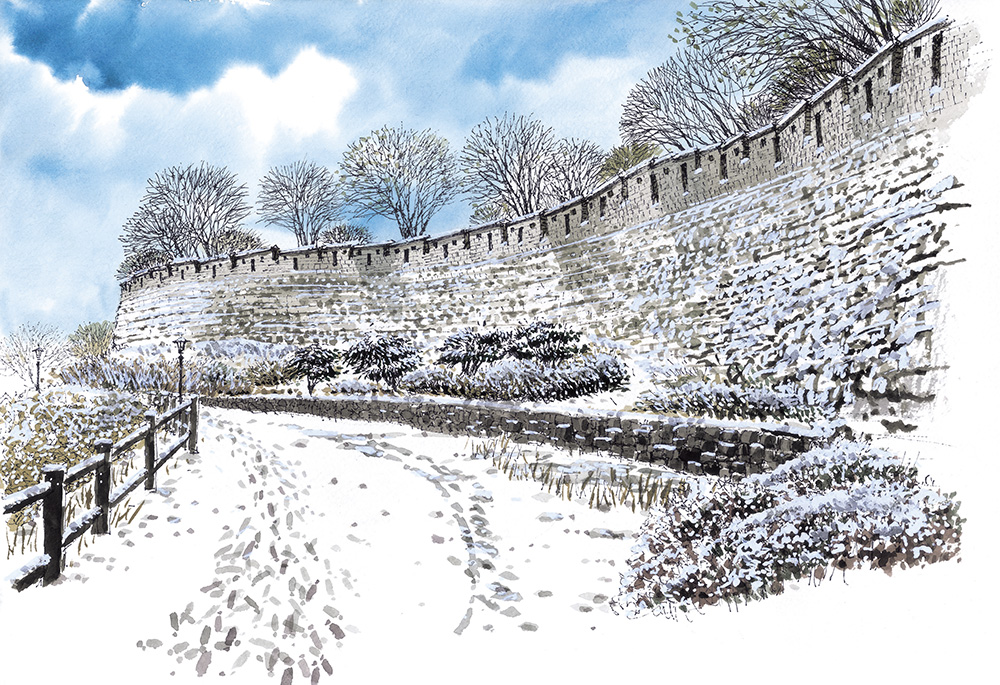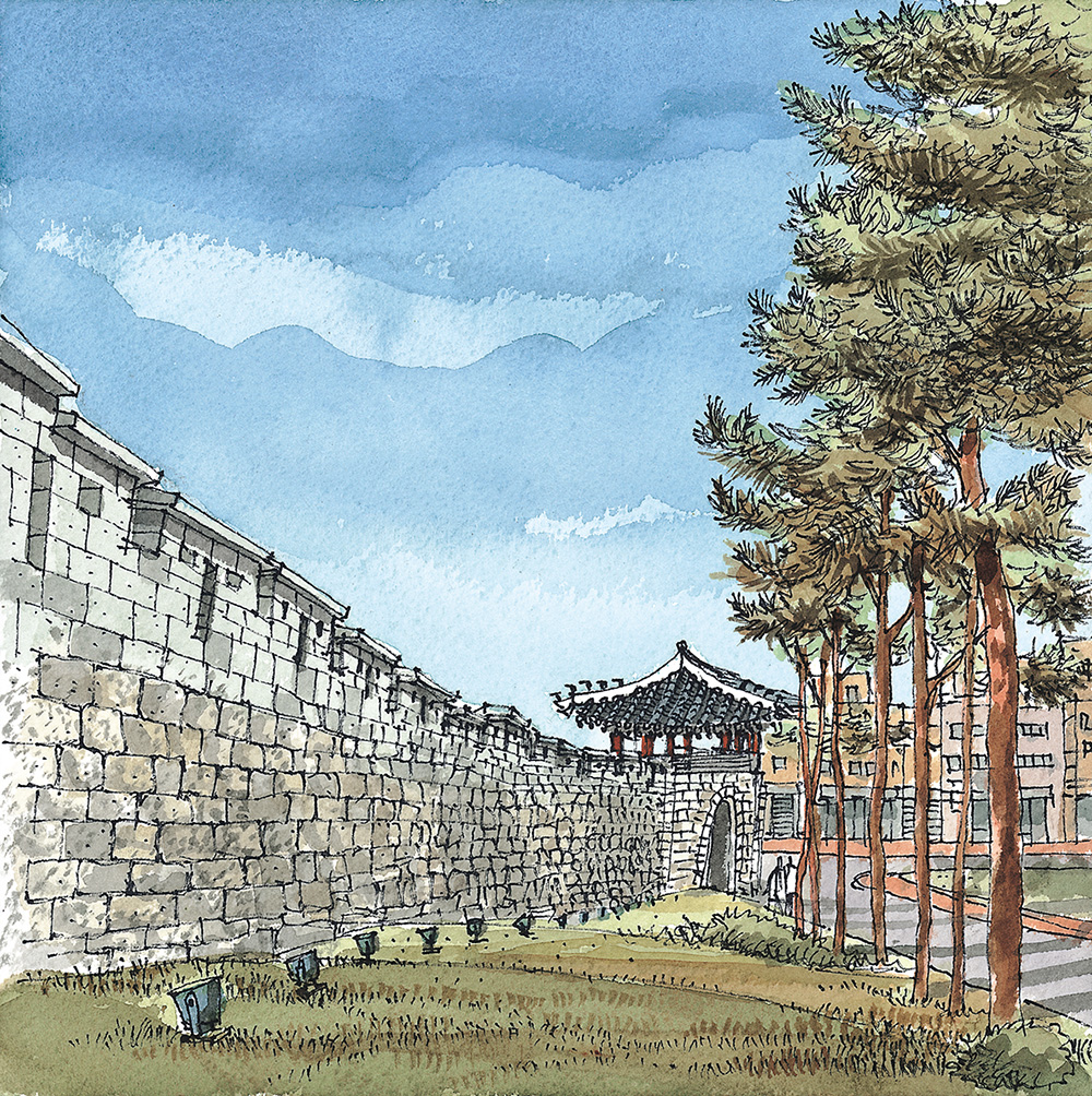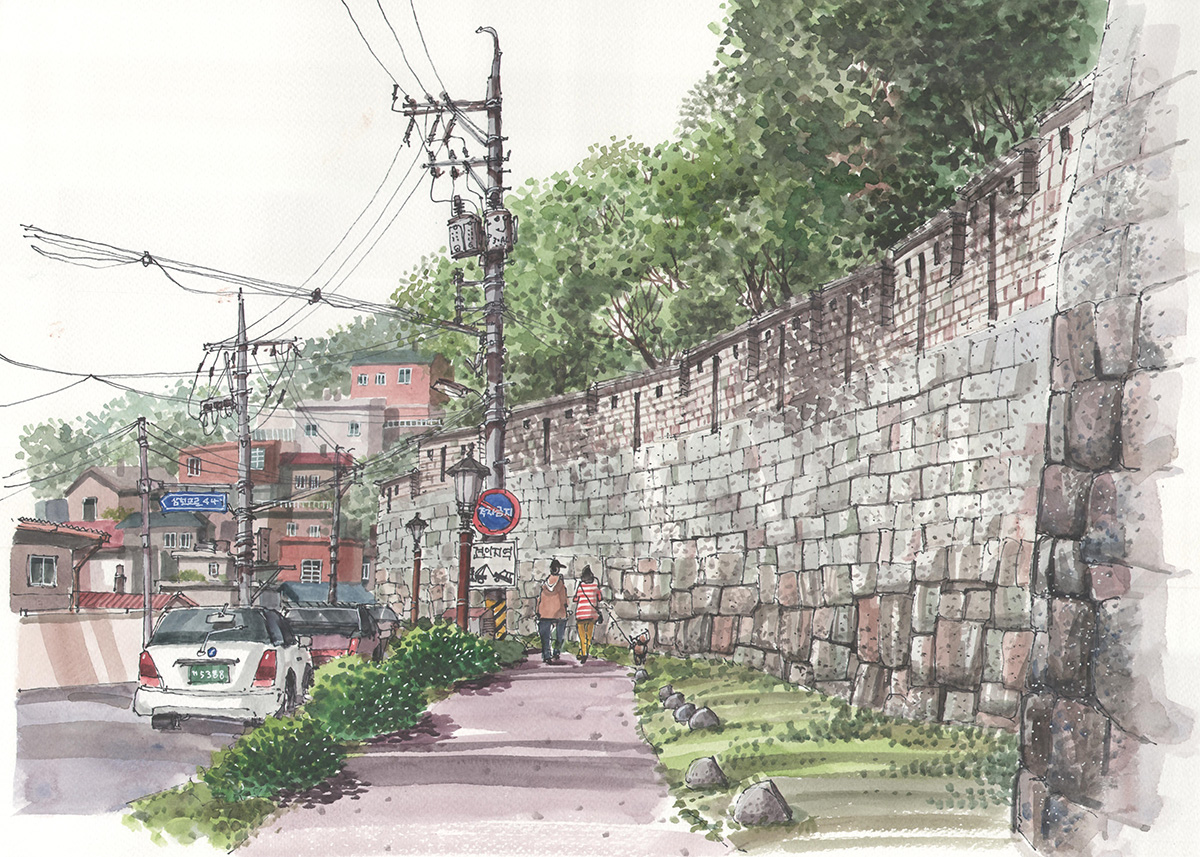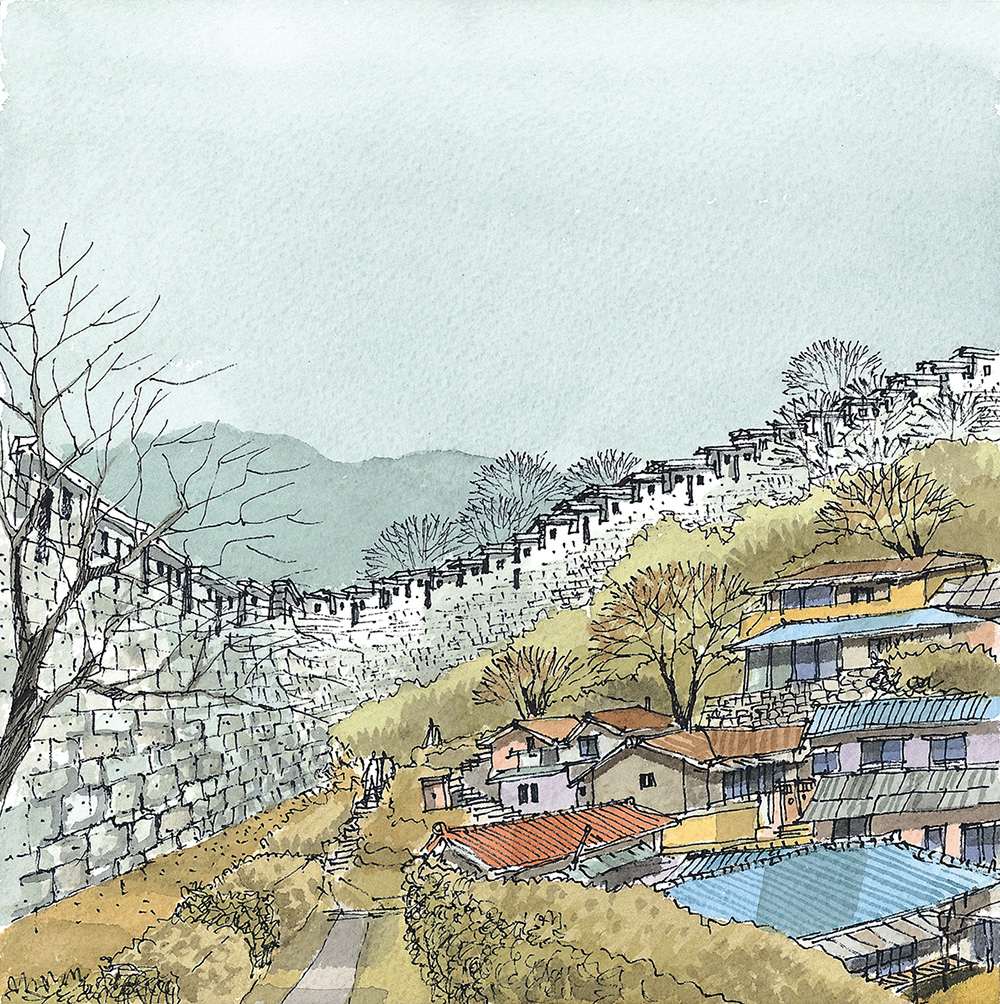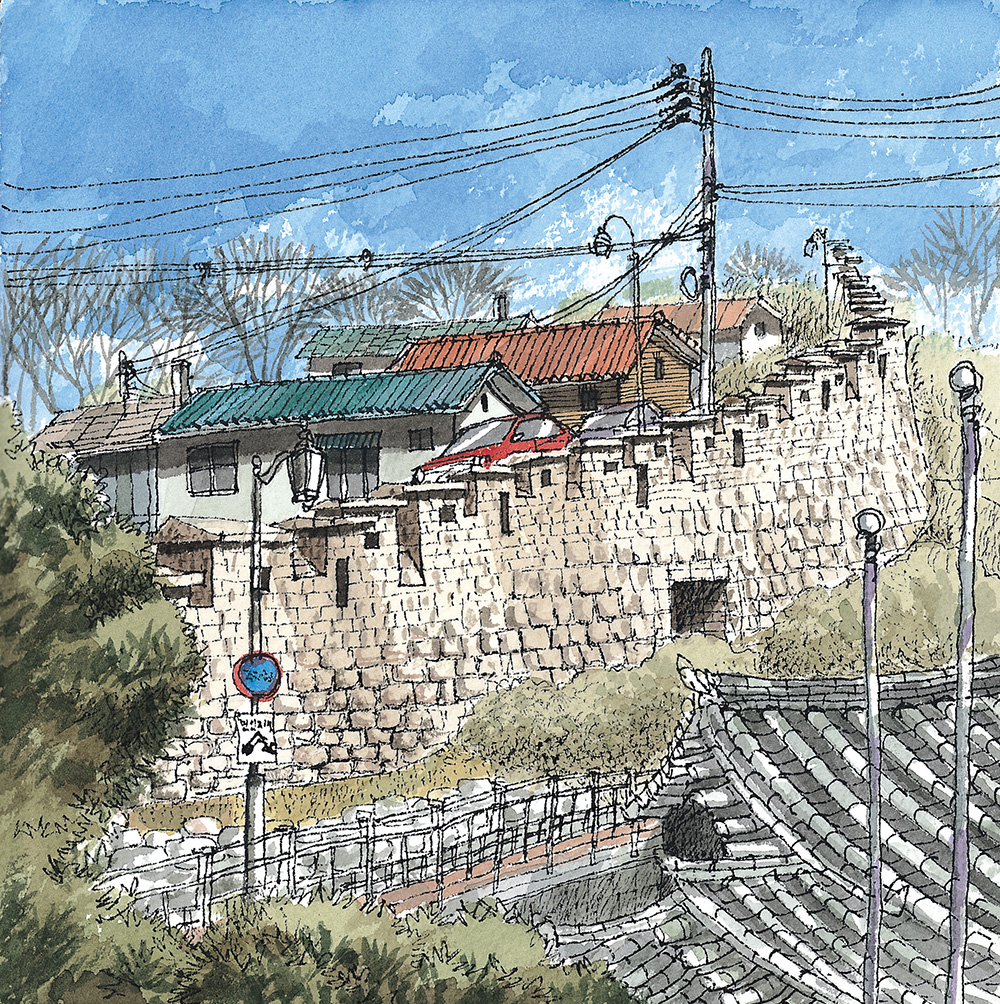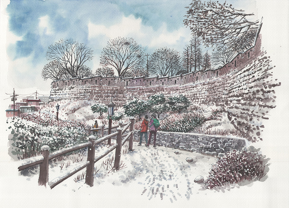 낙산 구간 몇 해 전에 눈이 내리는 한양도성 낙산 구간의 길을 걸어보고 싶어서 함박눈을 기다린 적이 있다. 설경 속에 하얗게 변한 한양도성과 마을의 풍경을 나의 눈으로 직접 확인하고 사진과 그림으로 꼭 기록하고 싶었기 때문이다. 평소에도 걸어보는 길이지만 눈이 내리면 저 성벽은 어떤 풍경을 보여줄까를 상상해보니 소풍을 앞둔 어린아이 마음처럼 설렜었다.