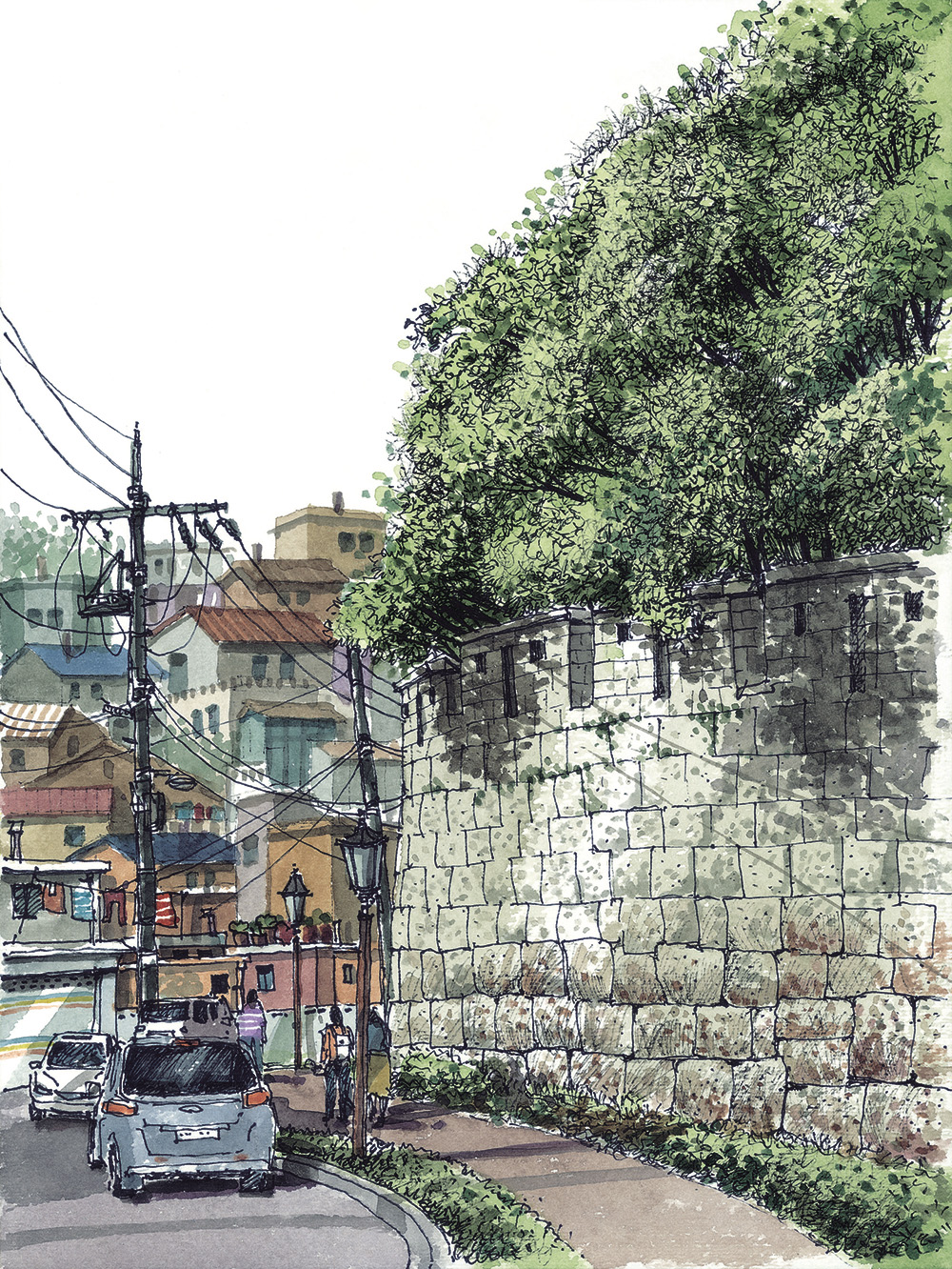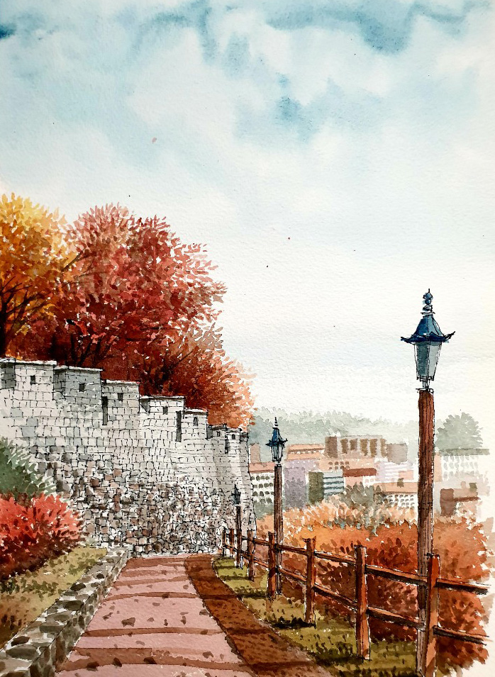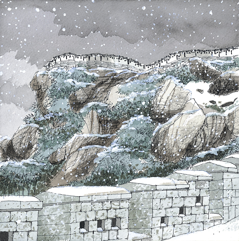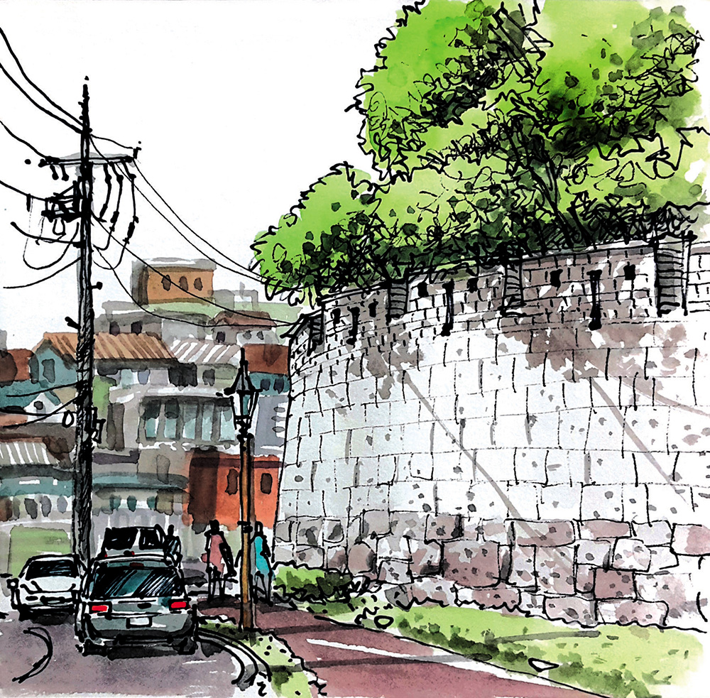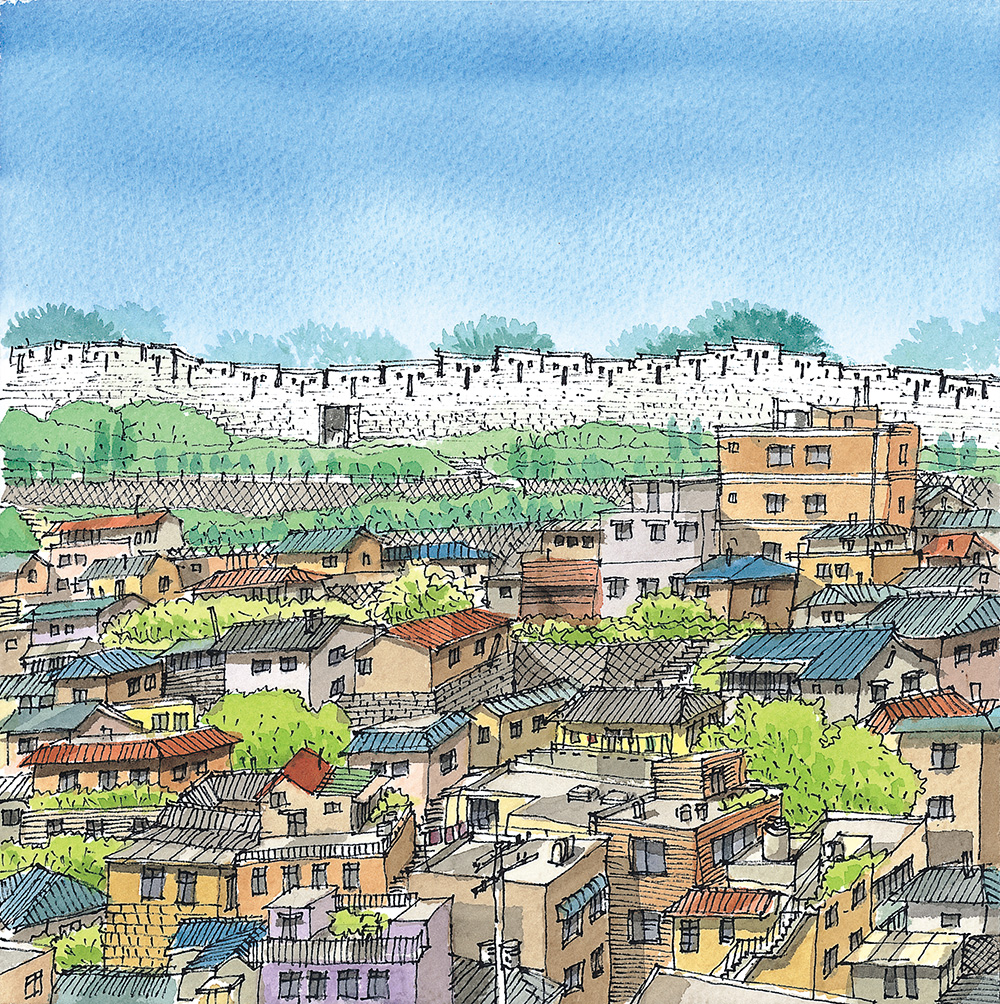 낙산 구간 몇 해 전에 눈이 내리는 한양도성 낙산 구간의 길을 걸어보고 싶어서 함박눈을 기다린 적이 있다. 설경 속에 하얗게 변한 한양도성과 마을의 풍경을 나의 눈으로 직접 확인하고 사진과 그림으로 꼭 기록하고 싶었기 때문이다. 평소에도 걸어보는 길이지만 눈이 내리면 저 성벽은 어떤 풍경을 보여줄까를 상상해보니 소풍을 앞둔 어린아이 마음처럼 설렜었다.