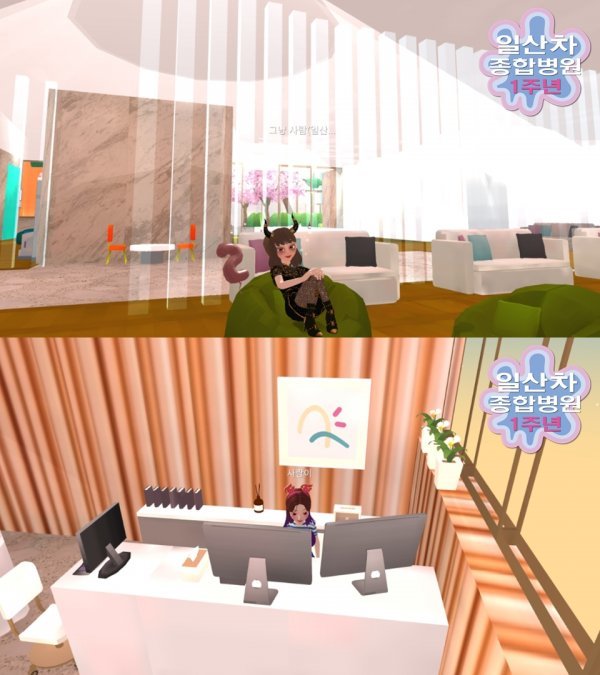 제페토 속 일산차병원 모습 (사진 제공 : 일산차병원) 의료계도 이에 발맞춰 메타버스를 활용하려는 움직임을 보이는데, 일산 차병원이 앞서서 새로운 시도를 시작했다. 지난 6월 개원 1주년을 맞은 일산 차병원은 국내 병원 중 최초로 국내 메타버스 플랫폼 제페토(ZEPETO)에 가상 병원을 개원했다. 실제 일산 차병원과 똑같은 공간을 가상 현실에 구현했고, 이벤트홀, 산부인과, 초음파실, 분만실, 행정사무실로 구성했다.