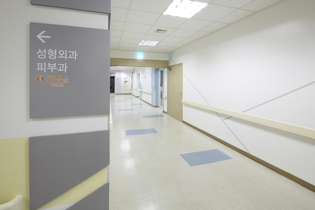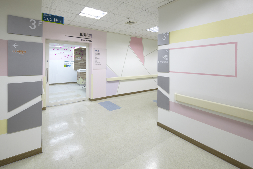 이는 종류가 천차만별하고 비교적 가격이 고가인 친환경 마감재의 다양한 재질을 선택하는 데에 늘 한계에 부딪칠 수 밖에 없었다. 디자인팀은 벽면에 사선 또는 직선의 라인으로 안정된 컬러를 선별하여 벽면에 사인이 접목된 디자인을 넣는 것으로 비용적인 한계를 극복해갔다. 이는 컬러를 달리해 환자들에게 인지성을 부여하는 시각적인 효과도 주었습니다. 예를 들어, 피부과나 성형외과가 분홍색이었다면 환자들이 컬러만 보고 자연스럽게 찾아올 수 있는 이정표의 역할을 하는 것이다.