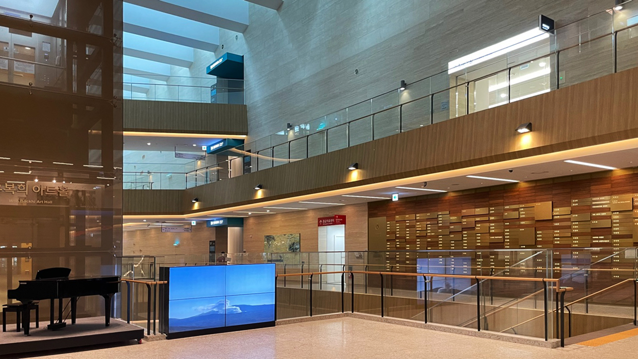 건물 로비부터 보이는 아트 큐브는 두 달에 한 번씩 작품이 바뀝니다. 현재 여러 작가가 대기하고 있고, 직원들과 환자들의 힐링 공간으로 너무나 중요하다고 볼 수 있습니다. 환자들은 새 작품이 걸리면 제일 먼저 와서 보시고 위안을 받으신다고 말씀하십니다. 특히 아트 큐브 앞 계단에서는 매주 수요일 날 앞서 언급했던 ‘수요음악회’를 진행했었습니다. 오케스트라 및 가수, 내부 성가단의 공연도 했었지만, 지금은 코로나가 4단계로 격상되어 운영하지 못하고 있는 상태입니다.