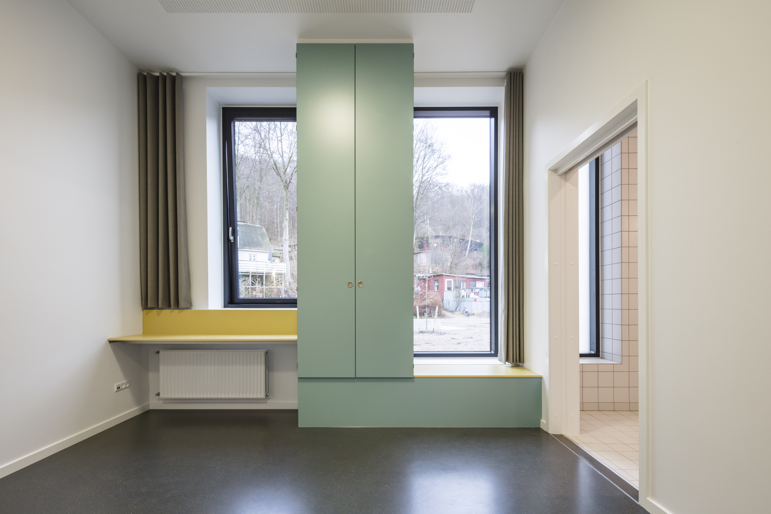 숲이 우거진 산비탈 위에 놓인 단층 건물은 경관에 조용히 자리 잡으며 녹색 풍경을 보존한다. 반대로 이 시설에 머무르는 환자들은 숲 외부의 시선으로부터 자유롭게 병원에서 생활할 수 있다. 자연과의 관계를 맺는 것에 초점을 맞춘 병원은 각 동마다 중정을 배치하고, 인동간격을 확보하여 모든 건물에서 충분한 채광을 누릴 수 있게 했다. 투명한 병동은 실외를 쉽게 내다볼 수 있고, 자연으로 이루어진 야외 공간으로의 접근성을 높여 환자의 힐링과 회복을 위한 최적의 환경을 만들었다.