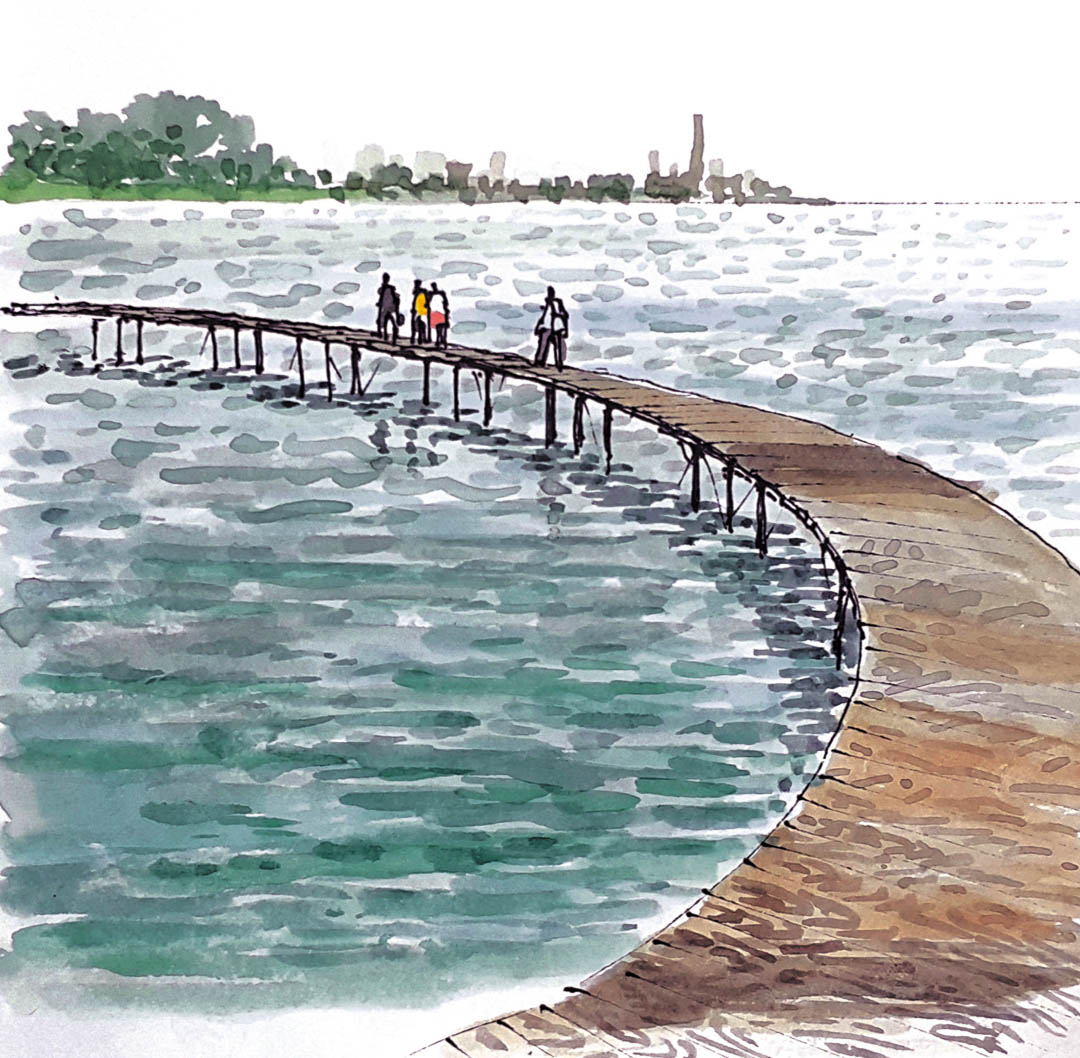 인근 해변에 위치한 커다란 써클의 목제 수상 산책로, Infinite Bridge는 설치미술에 가까운 구조물이다. 특별한 기능은 없지만 시원한 바람과 함께 맑은 바다 위를 걷는 기분은 색다르다. 아이를 유모차에 태워 나무로 만든 데크 위를 여유롭게 산책하는 젊은 부부들의 모습이 정겹다. 안전을 위한 난간조차 없는데 잘 활용되니 신통할 따름이다.