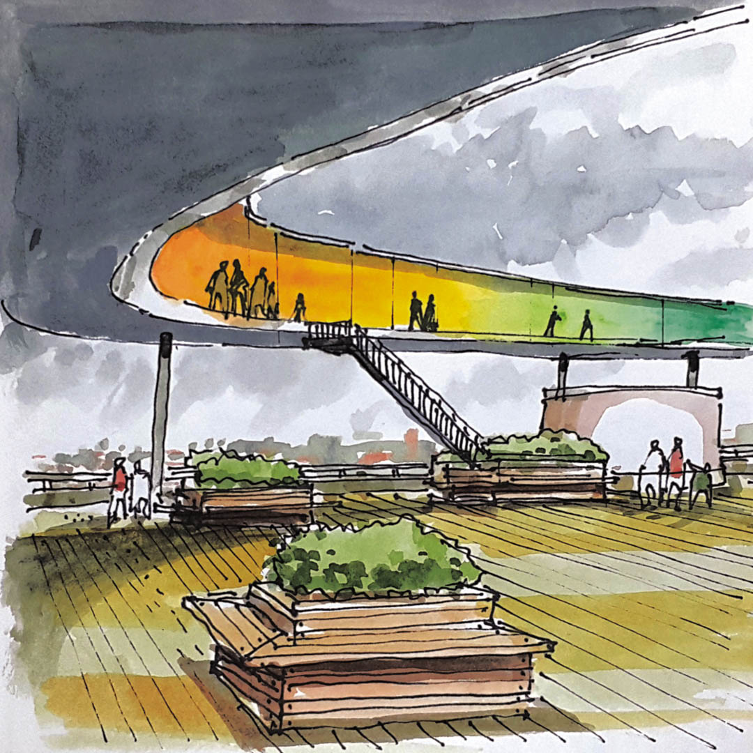 레인보우 파노라마 이 작품은 미술관 완공 후 공모에서 만장일치로 채택된 안이라고 한다. 미술관을 방문한 시민이나 관광객들에게도 가장 인기가 많으며 도시 전망대의 완벽한 역할을 해내고 있다. 자세히 관찰해보니 바닥과 천장의 작은 틈새가 있다. 공기가 아래로 들어와서 위로 나갈 수 있도록 설계한 디테일이 건축가의 눈에 직업병처럼 포착되는 법이다. 기압을 활용한 자연통풍 장치는 냉난방이 없는 실내공간에 환기와 더불어 실내외 온도 차이를 줄여 유리에 결로가 생기는 것을 막고 있다.