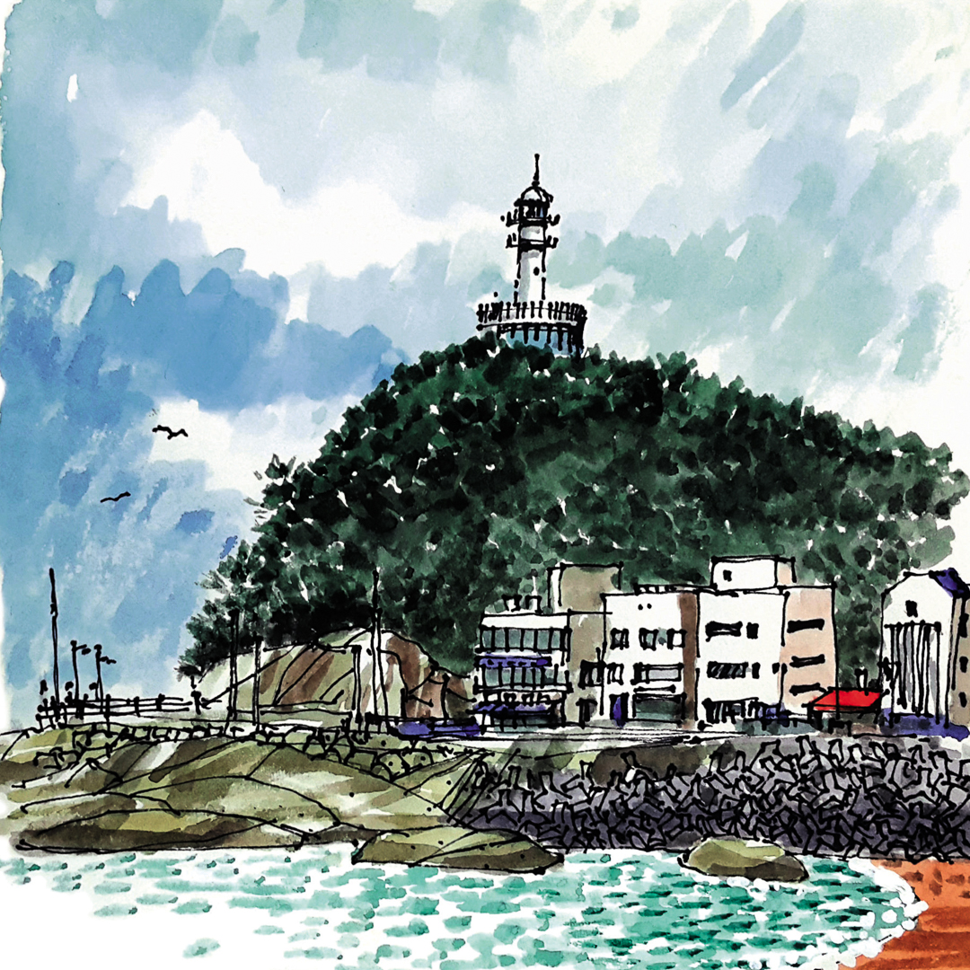 강릉 심곡항 바다에 박힌 바위들은 하나같이 주상절리의 경사진 주름을 가지고 있어 모양새는 다양하고 다이내믹하다. 방파제 하부에는 인간의 제조물인 테트라포드가 서로 몸을 엮어 지탱하고 있지만 오랜 세월, 스스로 파도를 이겨내는 견고한 자연석 바위는 독립적이라서 대조적이다. 방파제 끝에는 등대 하나가 아이콘처럼 존재한다. 초록색에 가까운 바닷물과는 보색대비를 이루는 붉은색 등대가 오늘따라 한가롭게 보이는지 갈매기의 날갯짓도 평화롭다. ‘깊은 계곡’이라는 이름의 항구는 청정지역이라 코로나 같은 역병도 지나쳐갈 것만 같다. 어쩌면 팬데믹이 그동안 무분별하게 자연을 파괴하고 지구환경을 오염시킨 인류에게 던지는 경고라면 심곡항과 같은 맑은 자연과 동네를 지키려는 노력과 의식이 더욱 절실하겠다.
