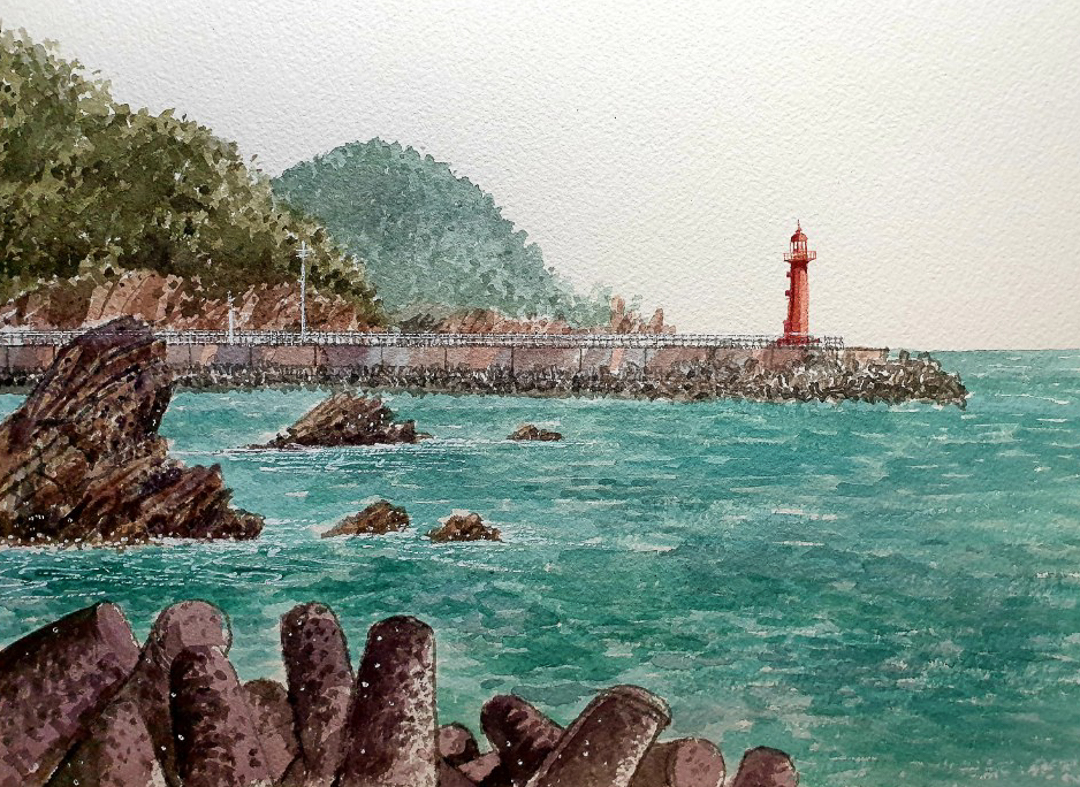 강릉 심곡항 바다에 박힌 바위들은 하나같이 주상절리의 경사진 주름을 가지고 있어 모양새는 다양하고 다이내믹하다. 방파제 하부에는 인간의 제조물인 테트라포드가 서로 몸을 엮어 지탱하고 있지만 오랜 세월, 스스로 파도를 이겨내는 견고한 자연석 바위는 독립적이라서 대조적이다. 방파제 끝에는 등대 하나가 아이콘처럼 존재한다. 초록색에 가까운 바닷물과는 보색대비를 이루는 붉은색 등대가 오늘따라 한가롭게 보이는지 갈매기의 날갯짓도 평화롭다. ‘깊은 계곡’이라는 이름의 항구는 청정지역이라 코로나 같은 역병도 지나쳐갈 것만 같다. 어쩌면 팬데믹이 그동안 무분별하게 자연을 파괴하고 지구환경을 오염시킨 인류에게 던지는 경고라면 심곡항과 같은 맑은 자연과 동네를 지키려는 노력과 의식이 더욱 절실하겠다.