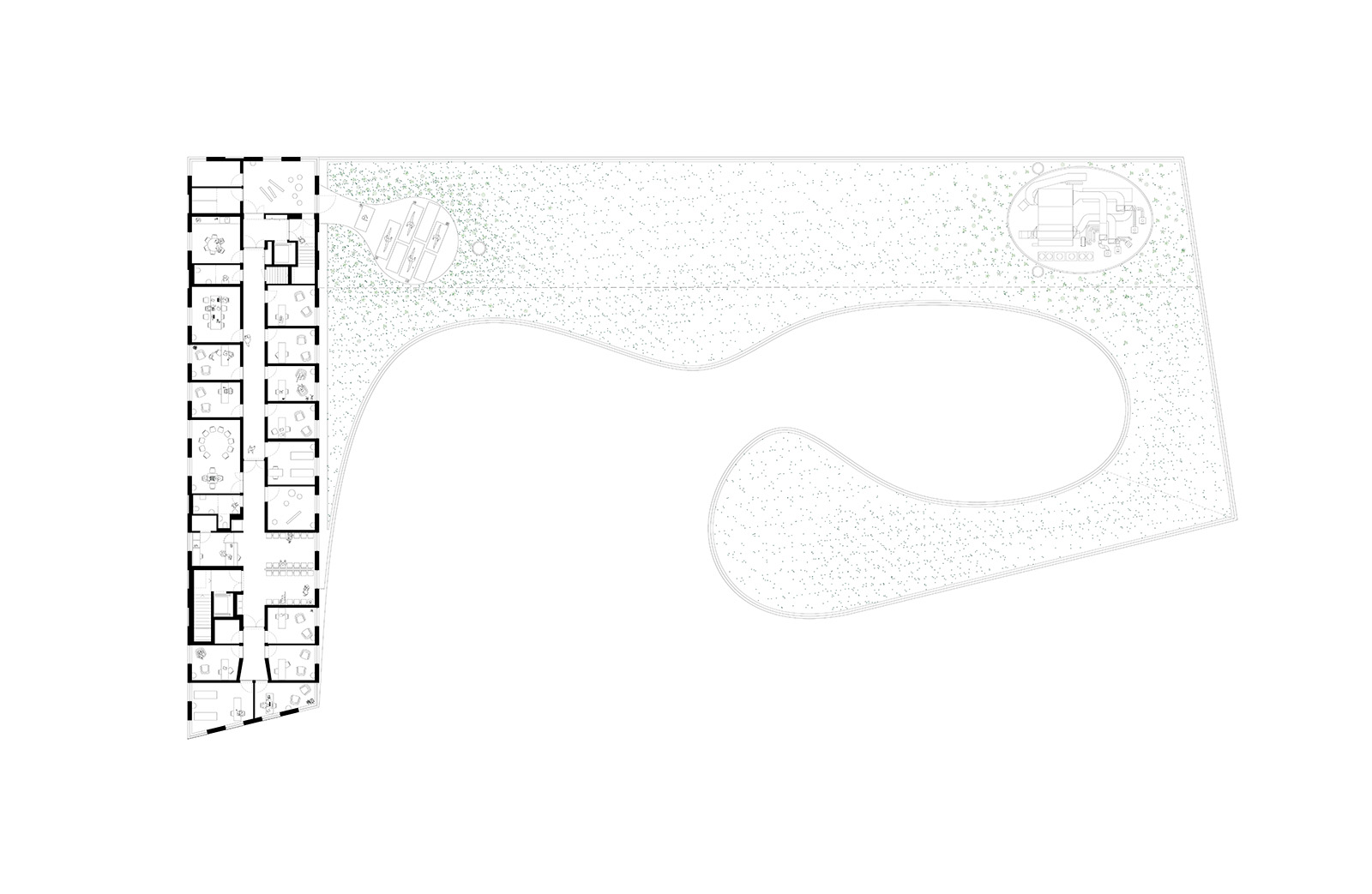 도시와 병원을 자연스럽게 이어주는 이른바 "매개 공간"은 환자 동선에 있어 필수적인 단계다. 도시 공간(매우 공적)에서 상담, 치료 또는 입원(본질적으로 사적)의 공간으로의 전환은 분절되어 있지 않고 연속적인 단계의 형태를 띈다. 마찬가지로 병원 환경에서 외래 환자 치료의 관련성을 유지하려면 외래 환자가 병원 내에서 가능한 한 적은 시간을 보낼 수 있도록 하는 단기 동선이 별도로 필요할 것이다. 이를 위해서 매개 공간은 병원과 도시 간의 교류가 크게 일어나도록 유동성과 개방성이 필요하다. 또한 대부분의 환자에 대한 체류 시간이 급격히 감소한 결과, 환자 호텔과 같은 새로운 중개 시설도 이 단계에서 제 역할을 하게 될 것이다.