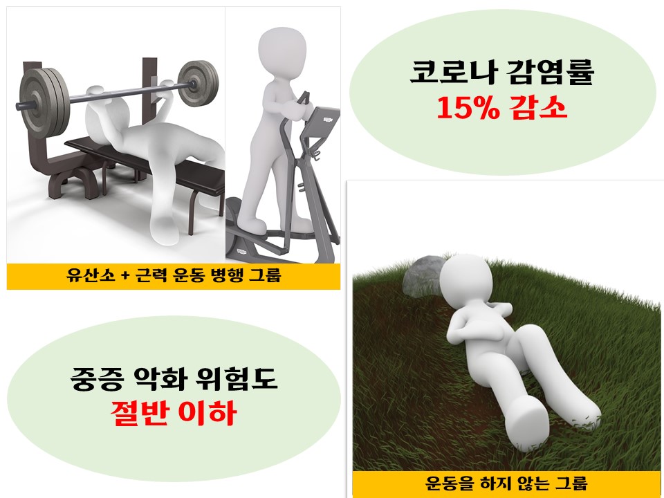 최근 국내에서도 이런 연구가 발표됐는데 연동건 서울대병원 소아청소년과 전문의·이승원 세종대 데이터 사이언스학과 교수·신재일 연세의대 소아 과학 교실 교수 연구팀이 공동으로 참여한 연구 결과에 따르면 적절한 운동이 실제로 코로나 19 감염과 중증 위험도를 낮추는 데 효과가 있음을 보여주고 있다. 연구팀은 2020년 1∼5월 코로나 19 검사를 받은 국내 20세 이상 성인 7만6천395명을 ▲ 운동이 충분하지 않은 그룹(4만 1천293명) ▲ 근력운동만 하는 그룹(5천36명) ▲ 유산소 운동만 하는 그룹(1만 8천994명) ▲ 유산소와 근력운동을 둘 다 충분히 하는 그룹(1만 1천72명)으로 나눠 코로나 19 감염률과 중증 악화 위험도를 비교 분석했다.