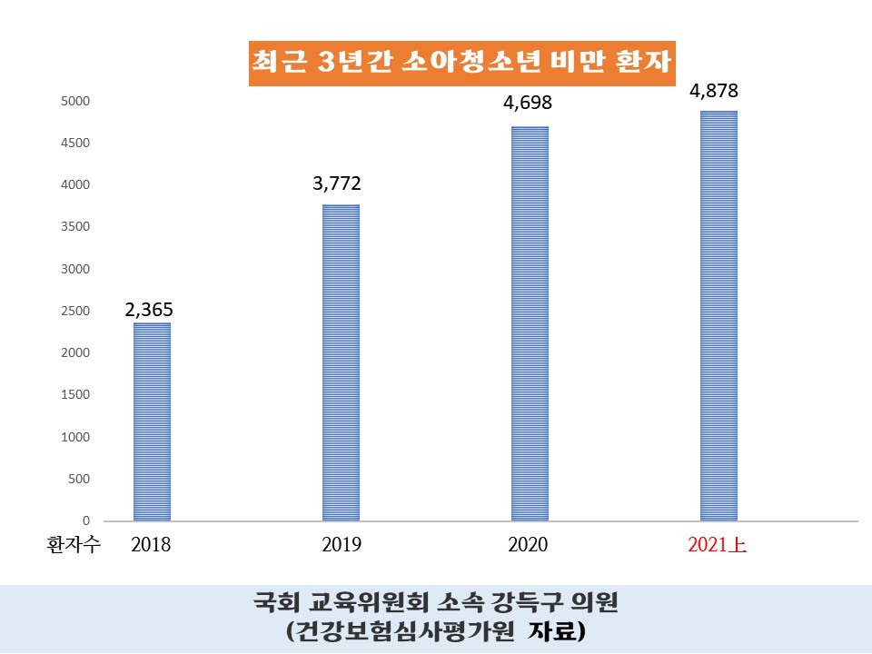 청소년들은 더 심각하다. 10월 15일 국회 교육위원회 소속 강득구 의원이 건강보험심사평가원으로부터 받은 ‘최근 3년간 비만으로 병원 진료를 받은 소아·청소년 현황’에 따르면 비만으로 진료를 받은 소아·청소년 환자가 2년 새 약 2배가량 증가했다. 특히 비만으로 병원 진료를 받은 소아·청소년은 지난 2018년 2,365명에 이어 2019년 3,772명, 2020년 4,698명, 2021년(상반기 기준) 4,878명으로 해마다 급증하는 추세를 보인다. 강 의원은 “코로나 19로 인해 학생들의 야외활동과 체육 수업 등이 줄어들면서 집에서 생활하는 학생들이 많아졌다”며 “자연스레 학생들의 배달·인스턴트 음식 섭취 등이 증가하면서 영양 불균형 문제가 심각하다”라고 지적했다.