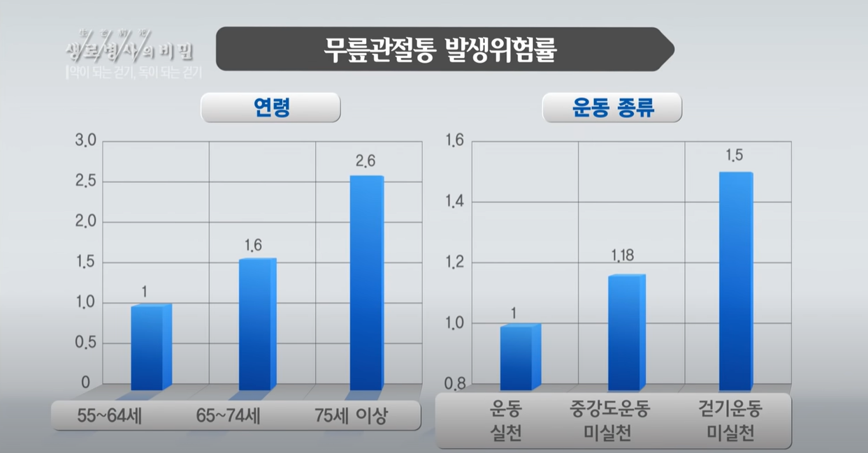 (KBS '생로병사의 비밀' 캡처) 아프다고 걸음을 멈춰서는 안 된다. 아플수록 더 걸어야 한다. 관절에 통증이 있으면 걸으면 증상이 더 악화하지 않을까 걱정하는 사람들이 많은데, 움직임이 있어야 관절 연골에 영양도 공급이 되고 적절한 자극이 있어야 연골이나 뼈 등 구조물들이 정상적으로 기능을 할 수 있다.