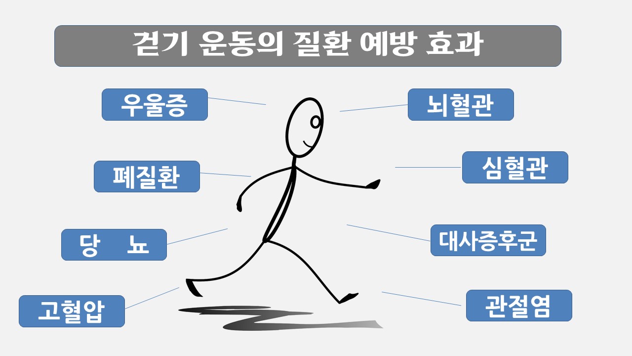 이처럼 걷기 운동의 질환 예방 및 치료 효과는 관절염, 뇌혈관질환, 폐 질환, 심혈관질환, 대사증후군, 당뇨, 고혈압, 우울증까지 가히 만병통치제라고 할 수 있다.