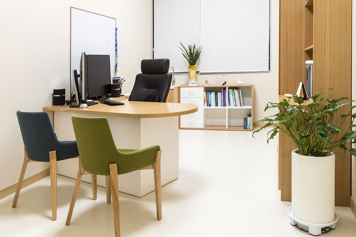 현재는 진료실입니다. 개업 초반부터 진료실에 대해서 조금 더 비중을 뒀습니다. 일단 일하는 의사들이 좋고 편해야 한다고 생각됩니다. 좁은 진료 공간에서 환자를 보고 있으면 정말 답답할 것 같습니다. 그래서 우리병원 진료실을 조금 넓게 디자인했습니다. 저는 진료실에서 아침마다 커피를 갈아 마십니다. 채광도 잘 들어와 따스한 기분을 매일매일 느낍니다. 항상 제가 있는 공간이 행복하고 좋아야만 환자들에게까지 그 좋은 영향이 미칠 것으로 생각합니다. 그래서 전반적으로 우리병원 원장님들 진료실이 넓은 편입니다. 또 현재 원장님들의 진료실에 대한 만족도가 매우 높습니다.