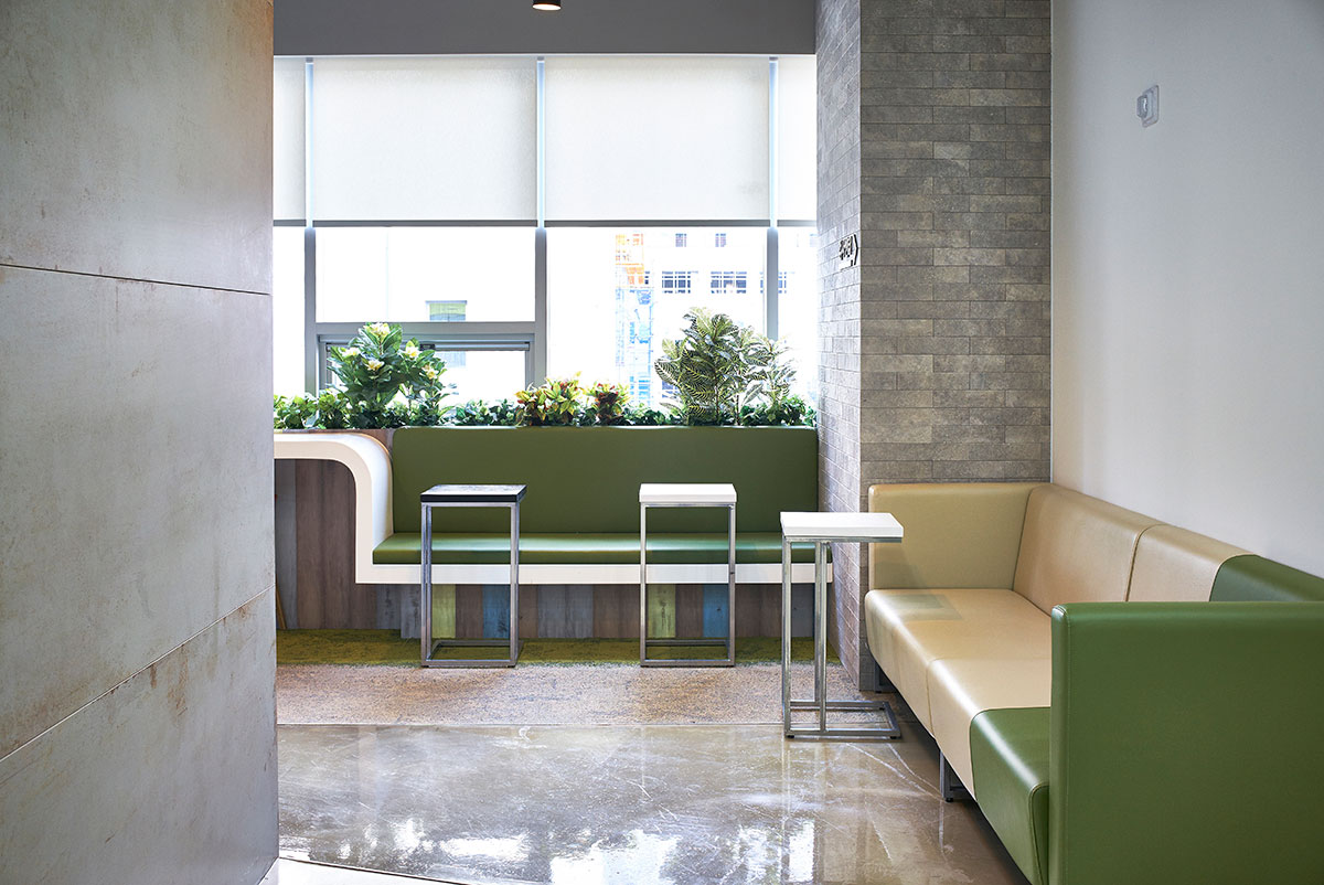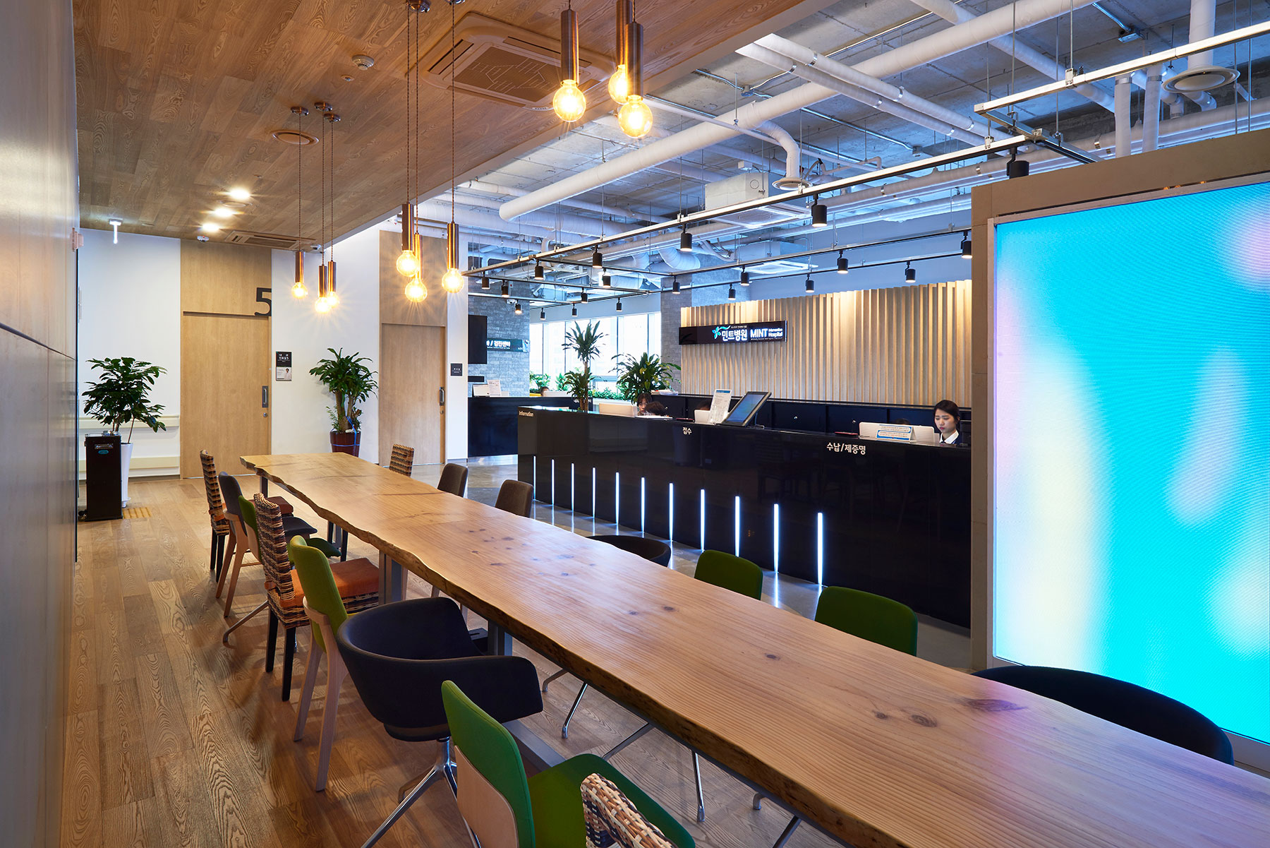 디자이너 : 처음부터 설계 기간 내내 플랜을 만들어 나가다 보니 디자인 면에서 생각하지 못했던 많은 부분이 협의 하에 새롭게 구현될 수 있었습니다. 저 역시 그동안 시도해보지 않았던 많은 부분을 민트병원에서 만들어낼 수 있었죠. 원장님께서는 디자이너의 판단을 적극적으로 수용해 주셨고 서로 간의 믿음이 있었기에 그런 모든 부분에서 잘 진행할 수 있었습니다. 예를 들어, 병원 대기실에 넓은 목재 테이블을 둔다는 것은 5년 전에 상상할 수도 없던 일이었습니다. 그리고 채광이 들어오는 라인이 실별에 맞게 진행된다든가, 직원 휴게실이나 진찰실 배치 등은 다른 병원에서 볼 수 없을 만큼 참신했죠. 최대한 환자들이 병원에 들어왔을 때, 여기서 누릴 수 있는 것들을 많이 누리게 하자는 게 주목적이었습니다. 변화는 처음부터 많이 주려고 해서 생겨난 것이 아니라, 아주 작은 부분에서 만족이 되는 것들을 조금씩 만들어가는 것이라고 생각합니다. 특히 천정을 노출한 것도 당시 카페에서나 볼 법한 인테리어였습니다. 소재나 컬러 역시 제 나름의 전문적인 영역임에도 불구하고 ‘어떻게 해야 좀 더 친환경적일까?’, ‘어떻게 해야 환자들에게 좋을까?’를 충분히 고민해서 결정했습니다. 그만큼 설계 과정에 계속된 피드백을 나누면서 진행하다 보니 상도 받고, 좋은 성과를 낼 수 있었다고 생각됩니다.