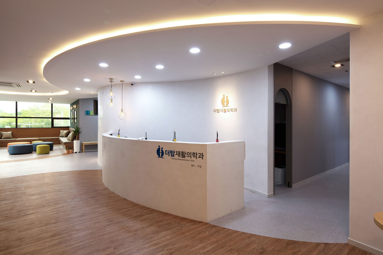 더탑재활의학과 의원은 전적으로 환자 중심의 공간으로 디자인됐다. 특히 병원 위치상 양재 시민의 숲이 있어 대기 공간에서는 큰 창으로 확 트인 전망을 볼 수 있다. 창가에는 둥근 테이블과 안락한 의자를 놓아 카페 같은 분위기가 연출됐다. 대기 공간에서 느껴지는 분위기는 편안함과 온화함이다. 바닥은 원목의 컬러감으로 띠를 두르고 벽면을 따라 제작한 붙박이 좌석 겸 소파 역시 브라운 계열의 짙은 컬러가 적용되었다. 또 한 벽지는 짙은 그린을 선택해 마치 나무 아래, 안락한 쉼이 되게 한 점이 돋보인다. 중앙에는 블루, 그린, 오렌지 톤의 스툴을 놓아 알록달록한 분위기마저 더해준다.