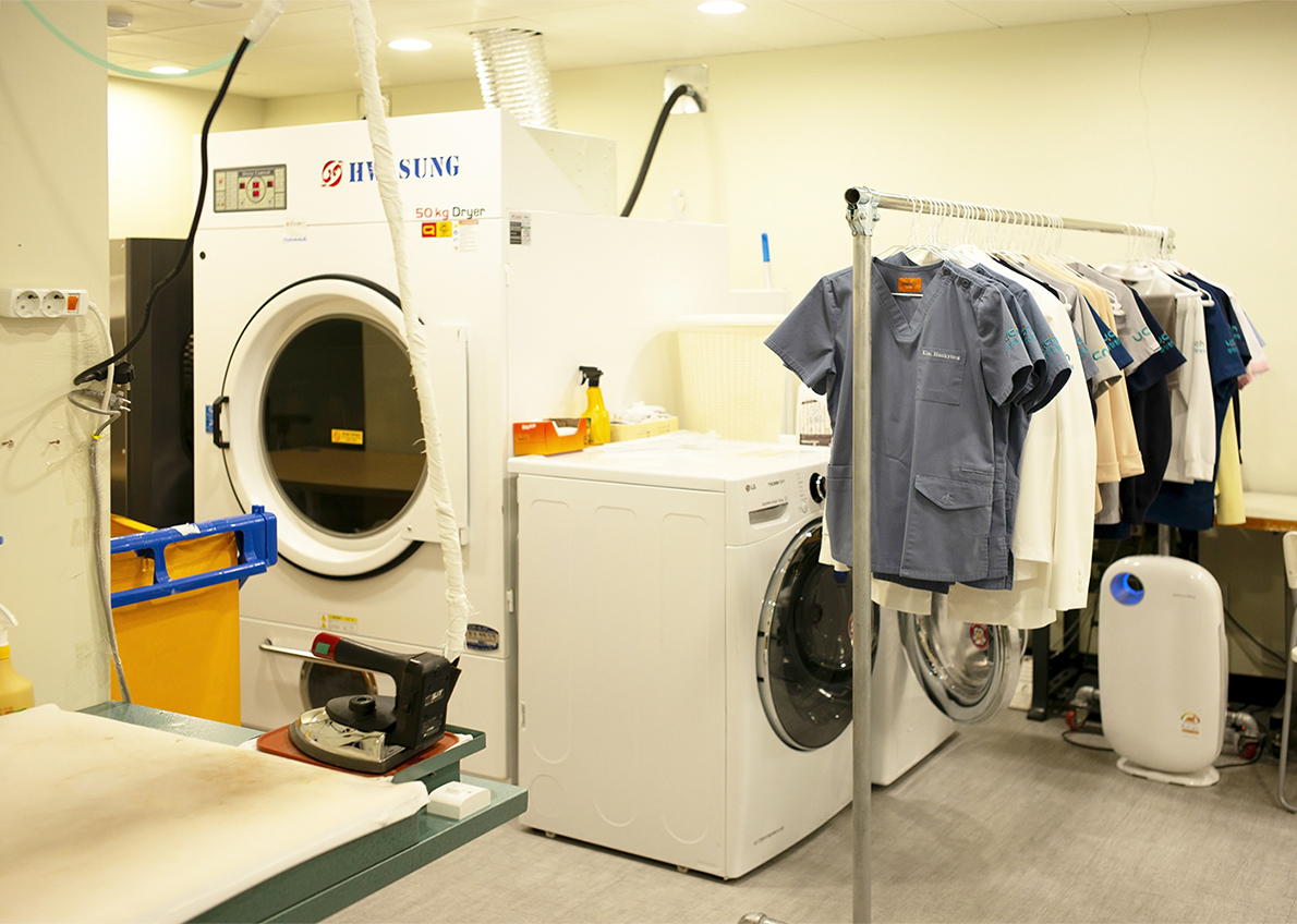염창환병원 식당 마지막으로 세탁실입니다. 세탁실이 없어 외주를 주다 보면 옷에 화학 처리를 많이 하게 됩니다. 그런데 우리 병원에서는 세탁실을 병원 안에 마련했습니다. 비용은 많이 들지만, 중요한 것은 직원들이 편해져서 그 자체로 만족스럽습니다. 예전에는 직원들이 본인의 가운은 집에서 직접 빨아야 했습니다. 현재는 이곳에서는 일주일에 두 번씩 빨 수 있어 훨씬 위생적입니다. 환자복도 유기농으로 소재에 신경을 많이 썼습니다. 결국은 내가 환자라는 생각으로 하면 됩니다.