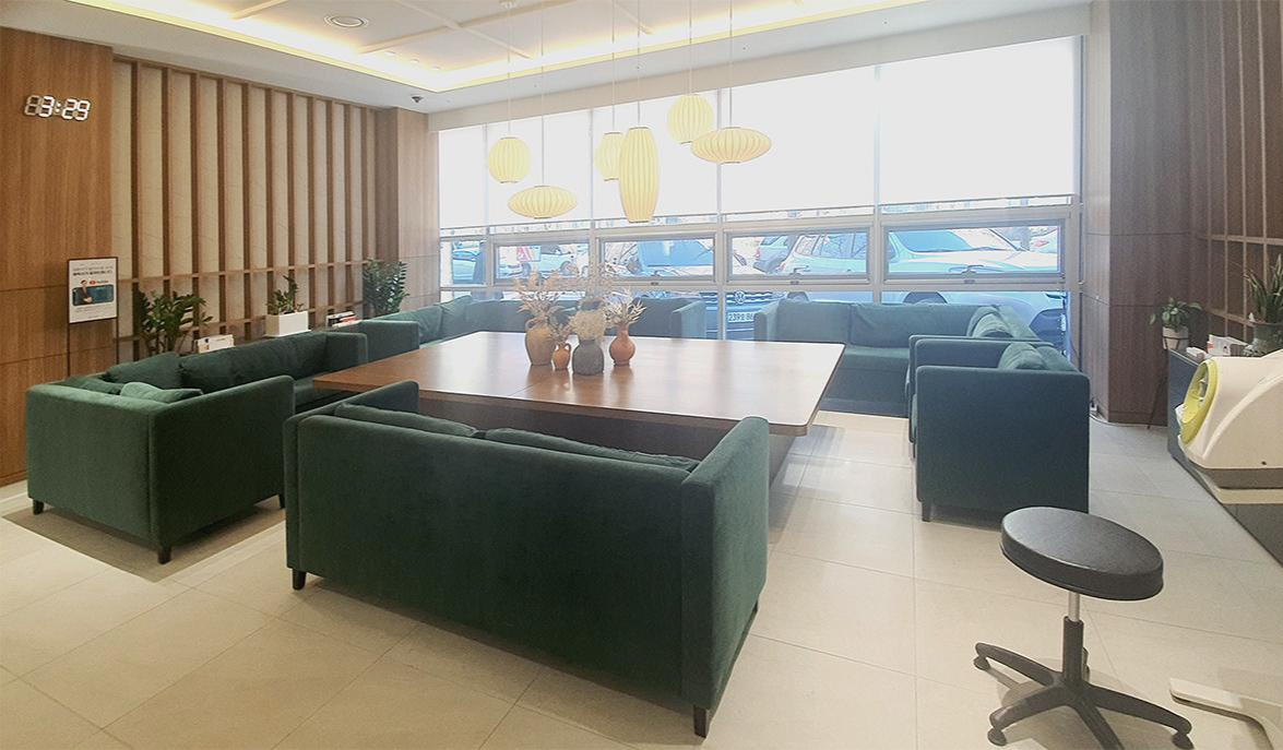 이번에 새로 이전한 병원은 로비부터 호텔에 온 듯한 착각을 불러일으킬 정도로 고급스러움과 편안함이 동시에 느껴졌다. 인포메이션을 중심으로 오른쪽에는 카페와 소파가 넓게 자리 잡았으며, 왼편에는 진료 공간으로 동선을 길게 확장시켰다. 커피를 내리는 바리스타 공간 앞에는 기다란 원목 테이블과 의자, 크기를 달리한 원형의 디자인 조명으로 조도를 조절하여 한층 아늑한 빛을 감돌게 했다. 또한 창가 앞을 가득 메운 초록색 소파와 원목 테이블로 공간의 분위기를 내추럴하게 이끌었다.