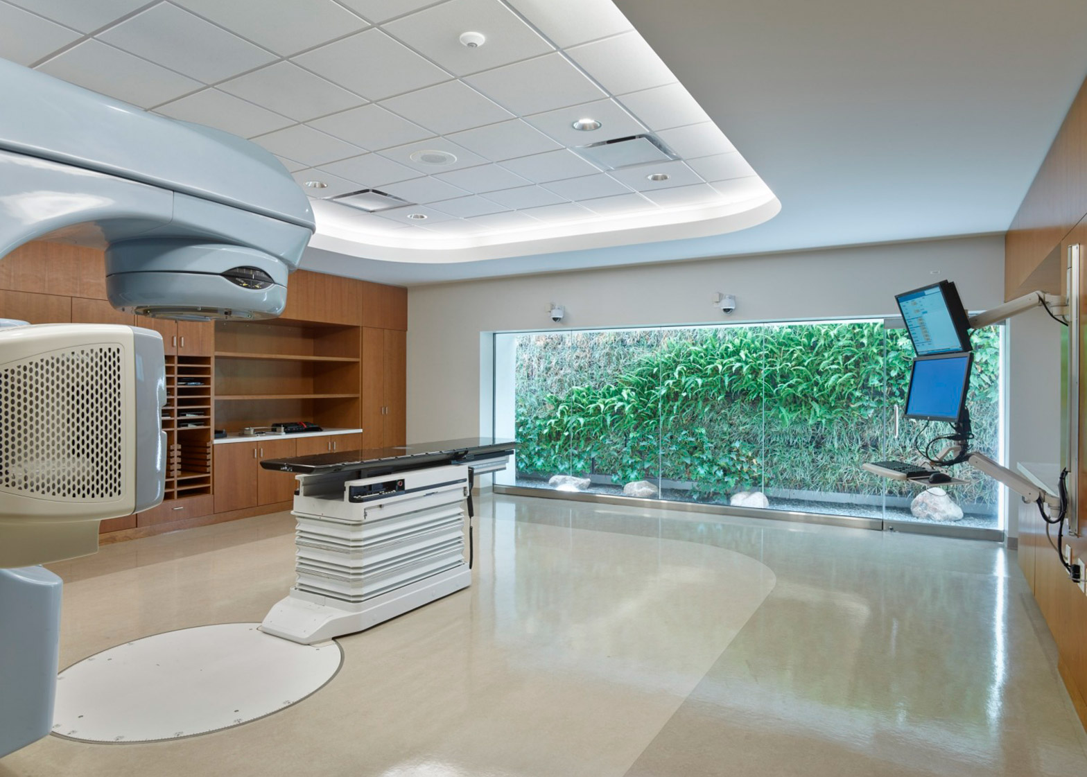시설 프로그램에는 검사실 및 치료실, 사무실, 직원 라운지 및 회의실이 포함되며, 각 방을 가로질러 뻗어 있는 유리벽은 Zen 정원과 플러시 천으로 된 수직 정원으로 연결된다. 특히 암환자의 종양 제거를 위해 방사선을 사용하는 3개의 선형 가속기 치료실은 원형의 건물 중심부에 위치해 있는데, 방사선실을 지면에 배치하는 대신, 3피트(91센티미터) 두께의 콘크리트 벽으로 둘러싸 무게와 방출하는 방사선을 완화하였다.