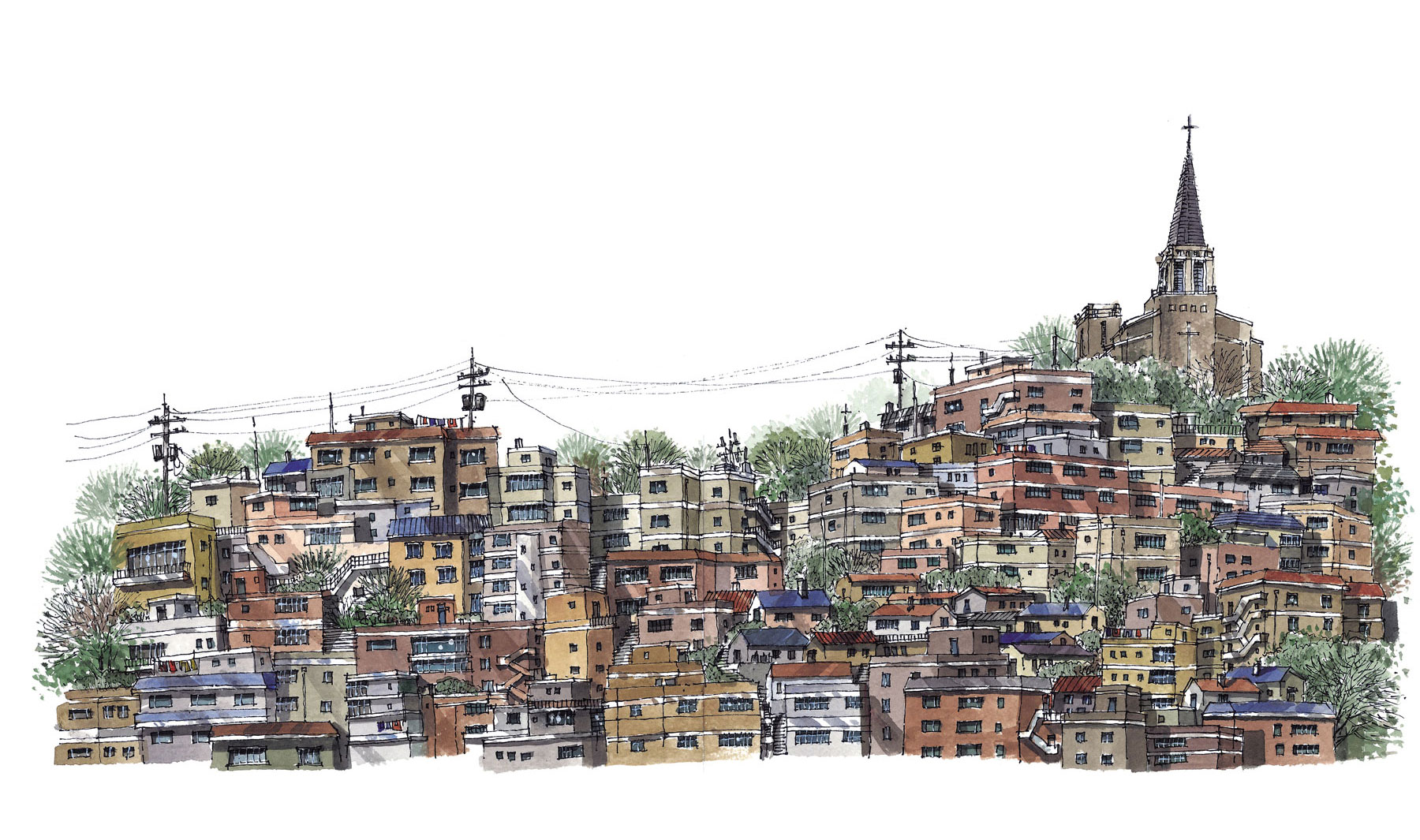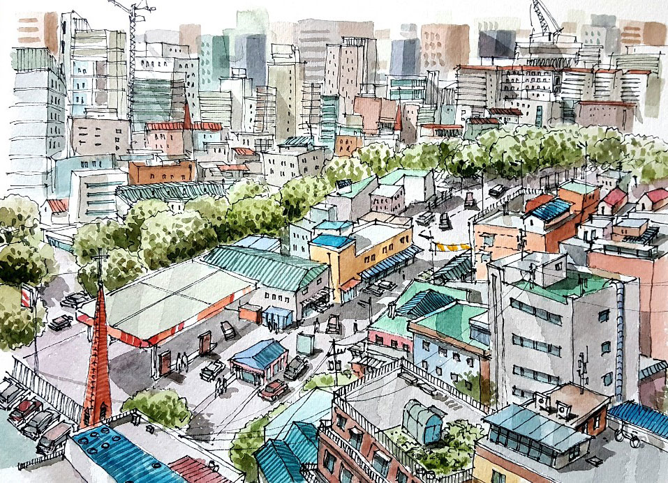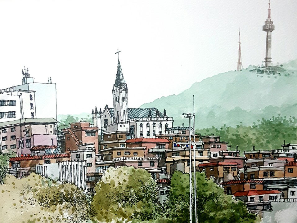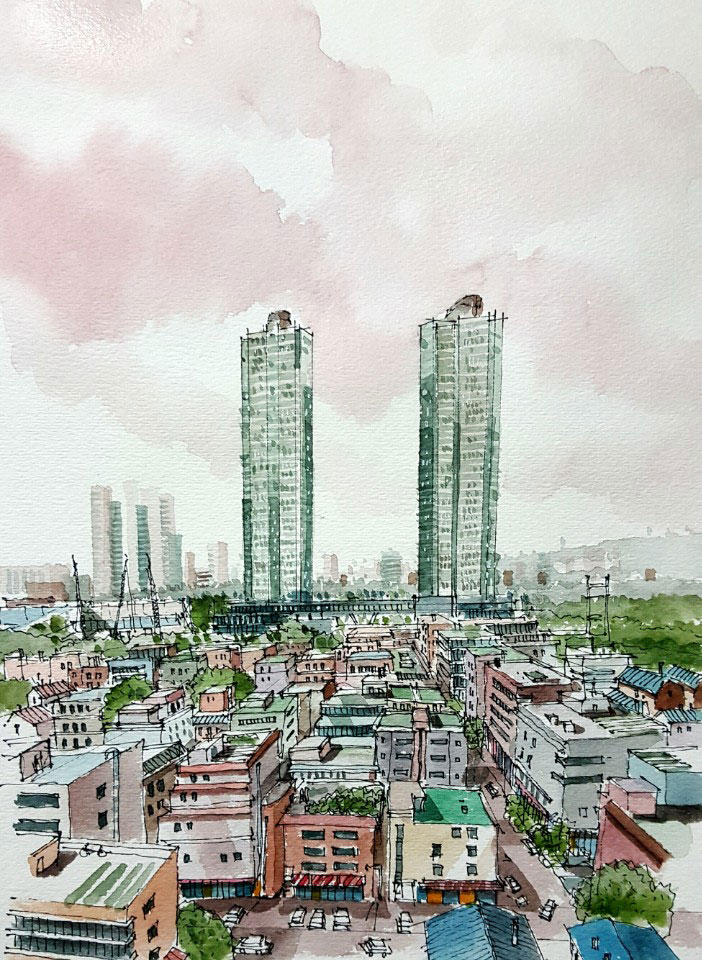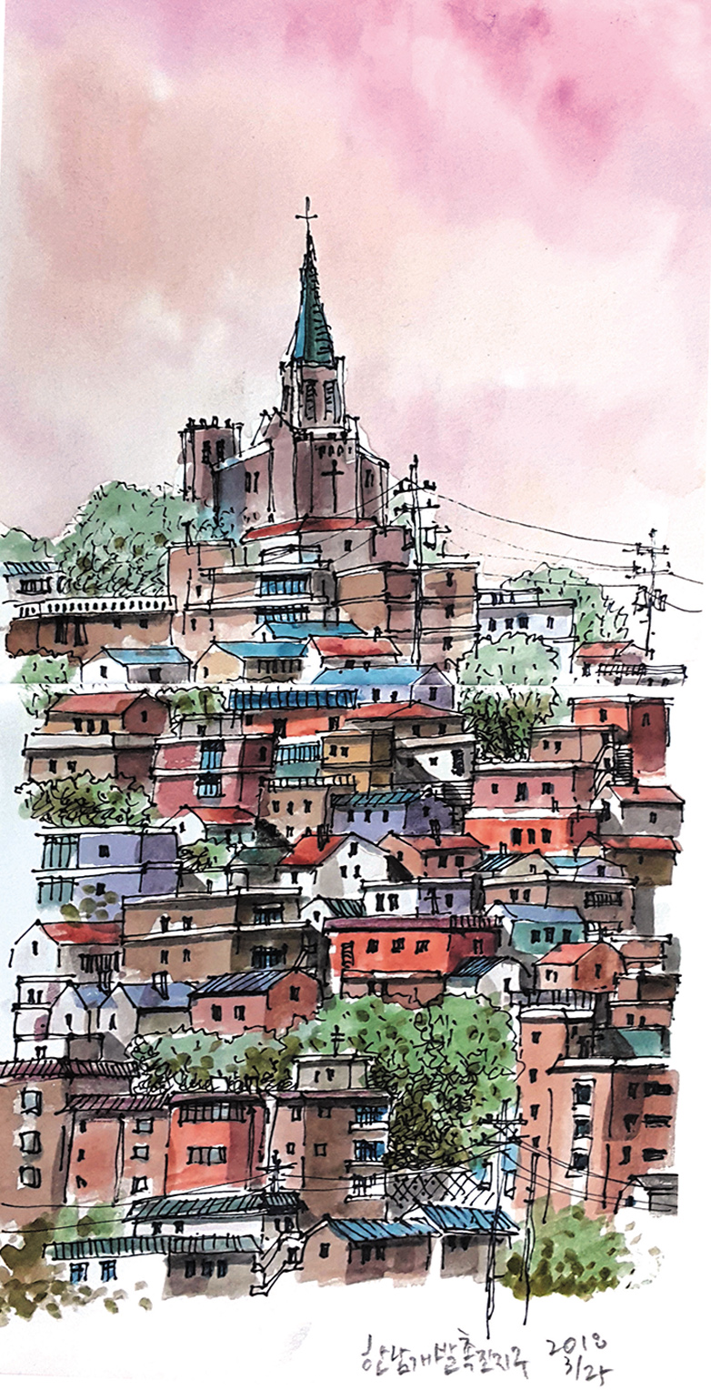 한남대교를 북단을 지나며 왼편 언덕위에 석양이 질 때 독특한 스카이라인이 눈에 띈다. 저밀도의 작은 규모의 집들이 경사를 이루며 포개져있고 마지막 정점에 교회가 서있는 장면이다. 나에게 서울 강북의 인상적인 풍경을 몇 개 꼽으라면 이 장소도 그중 하나에 포함된다. 꼭대기 교회로 불리며 한남동의 랜드마크 역할을 했던 한광교회는 한남뉴타운 3구역 개발과정에서 아쉽게도 철거될 운명이며 결국 역사 속으로 사라지게 될 것이다. 나는 건축가로서 그림으로 기록하는 일에 사명감을 가지고 있다. 이 풍경은 오래도록 나의 그림 안에 남아서 존치되기를 바란다.