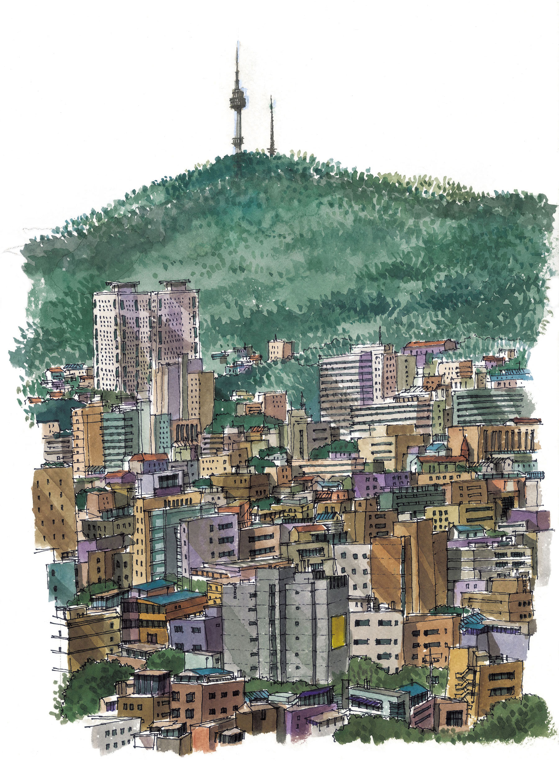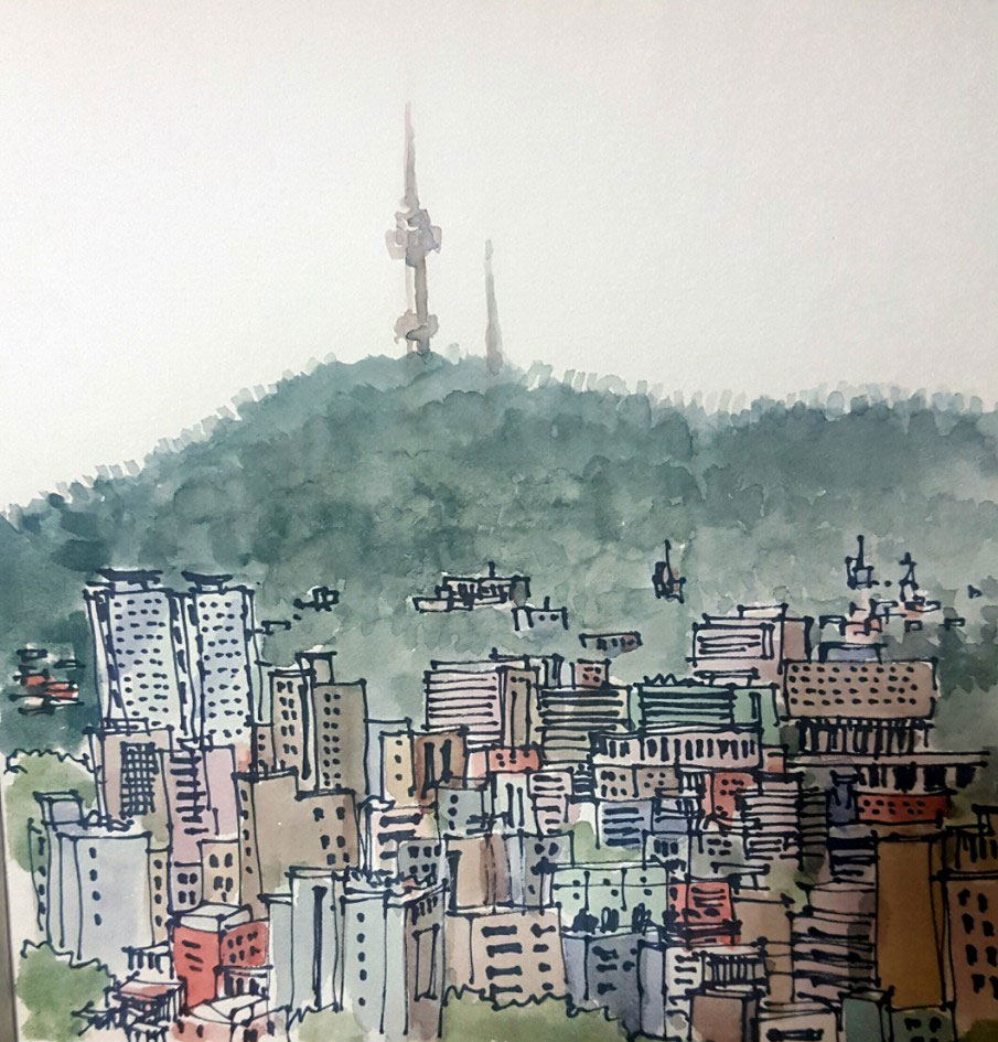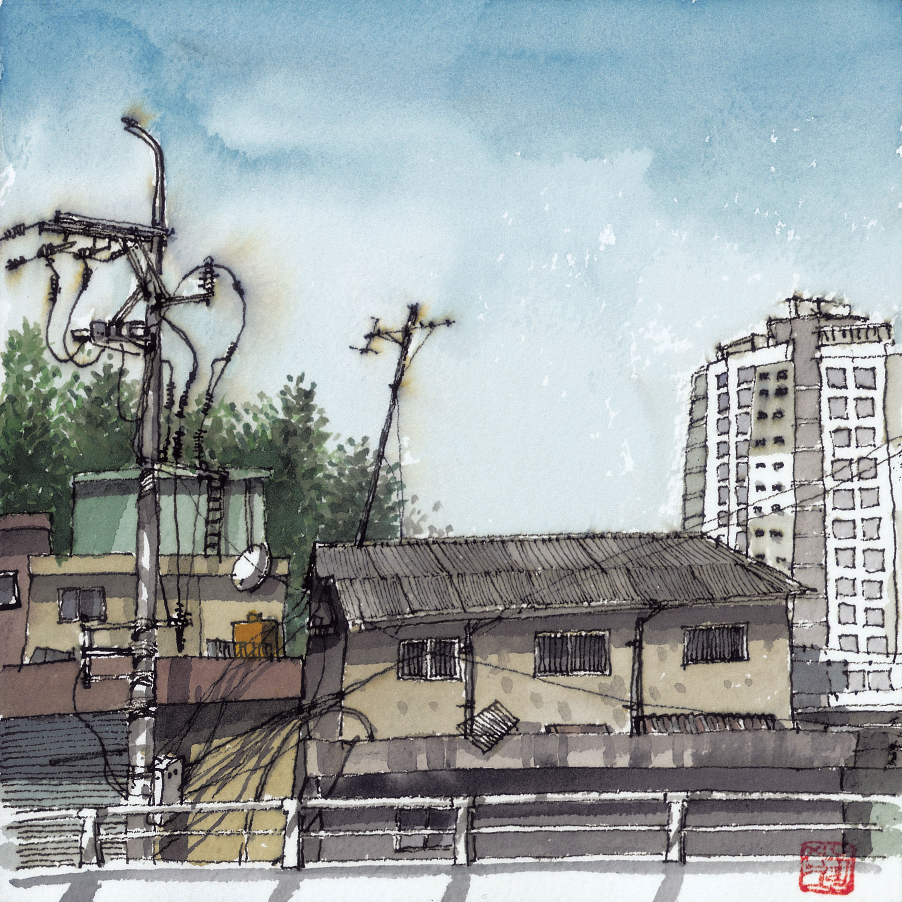 한남대교를 북단을 지나며 왼편 언덕위에 석양이 질 때 독특한 스카이라인이 눈에 띈다. 저밀도의 작은 규모의 집들이 경사를 이루며 포개져있고 마지막 정점에 교회가 서있는 장면이다. 나에게 서울 강북의 인상적인 풍경을 몇 개 꼽으라면 이 장소도 그중 하나에 포함된다. 꼭대기 교회로 불리며 한남동의 랜드마크 역할을 했던 한광교회는 한남뉴타운 3구역 개발과정에서 아쉽게도 철거될 운명이며 결국 역사 속으로 사라지게 될 것이다. 나는 건축가로서 그림으로 기록하는 일에 사명감을 가지고 있다. 이 풍경은 오래도록 나의 그림 안에 남아서 존치되기를 바란다.