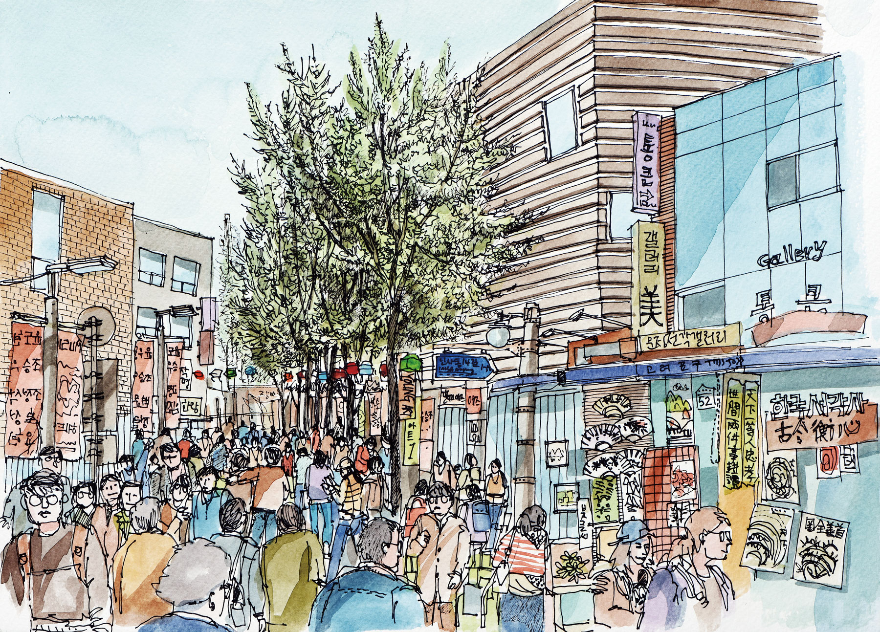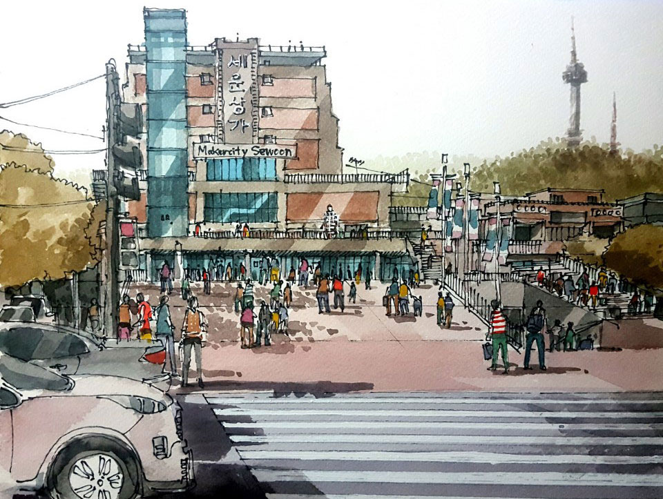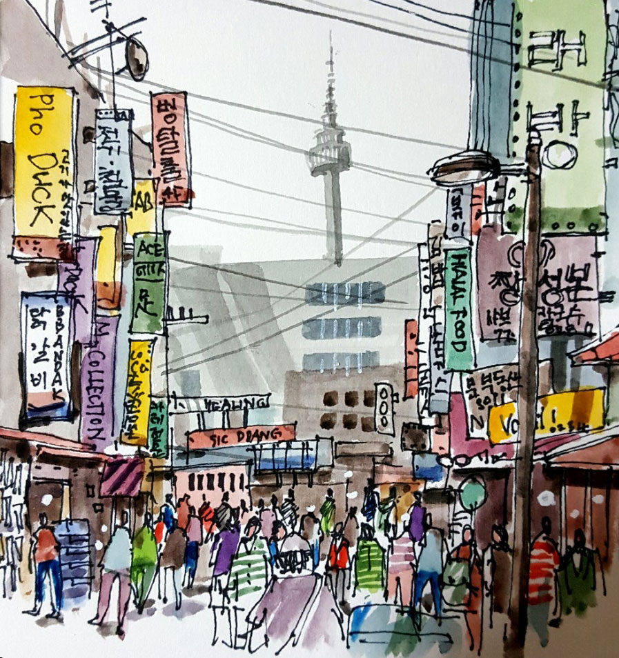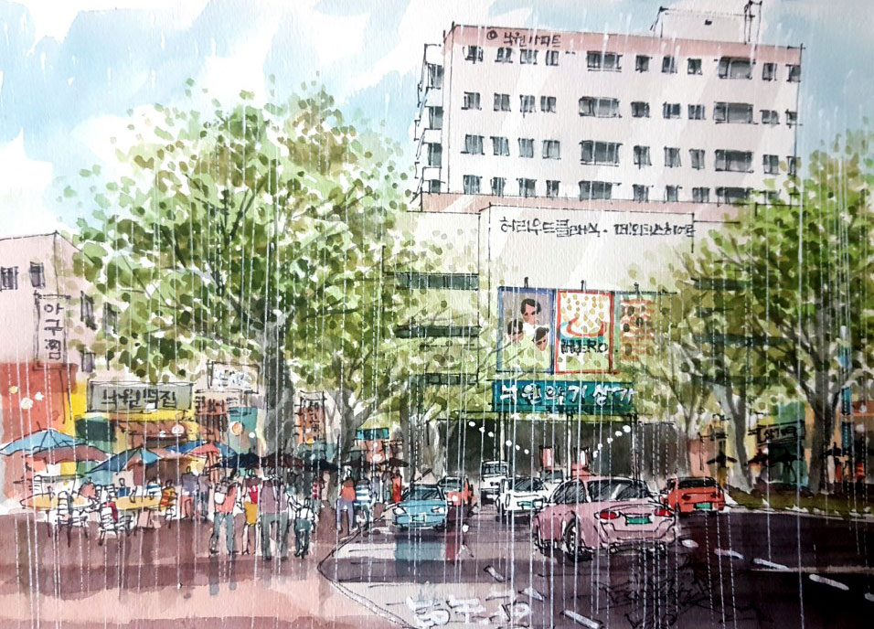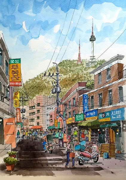 서울 명동 골목 이밖에도 정릉동에도 노후화된 가구의 집합들이 제법 많이 눈에 띈다. 우리 눈에 익숙한 풍경으로 오랜 시간들이 축적되어있어서 그림 그리기에는 좋은 소재다. 낙원상가 건물과 그 주변 인사동 역시 종로 거리에서 익숙한 풍경이다. 명동의 먹거리 골목도 관광객들에게 핫 플레이스다.