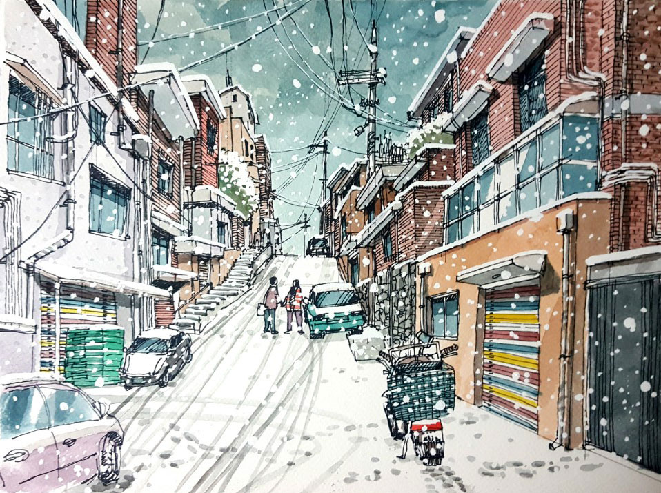 서울 정릉동 서울 정릉동 서울 낙원상가 서울 인사동 서울 명동 골목 이밖에도 정릉동에도 노후화된 가구의 집합들이 제법 많이 눈에 띈다. 우리 눈에 익숙한 풍경으로 오랜 시간들이 축적되어있어서 그림 그리기에는 좋은 소재다. 낙원상가 건물과 그 주변 인사동 역시 종로 거리에서 익숙한 풍경이다. 명동의 먹거리 골목도 관광객들에게 핫 플레이스다.