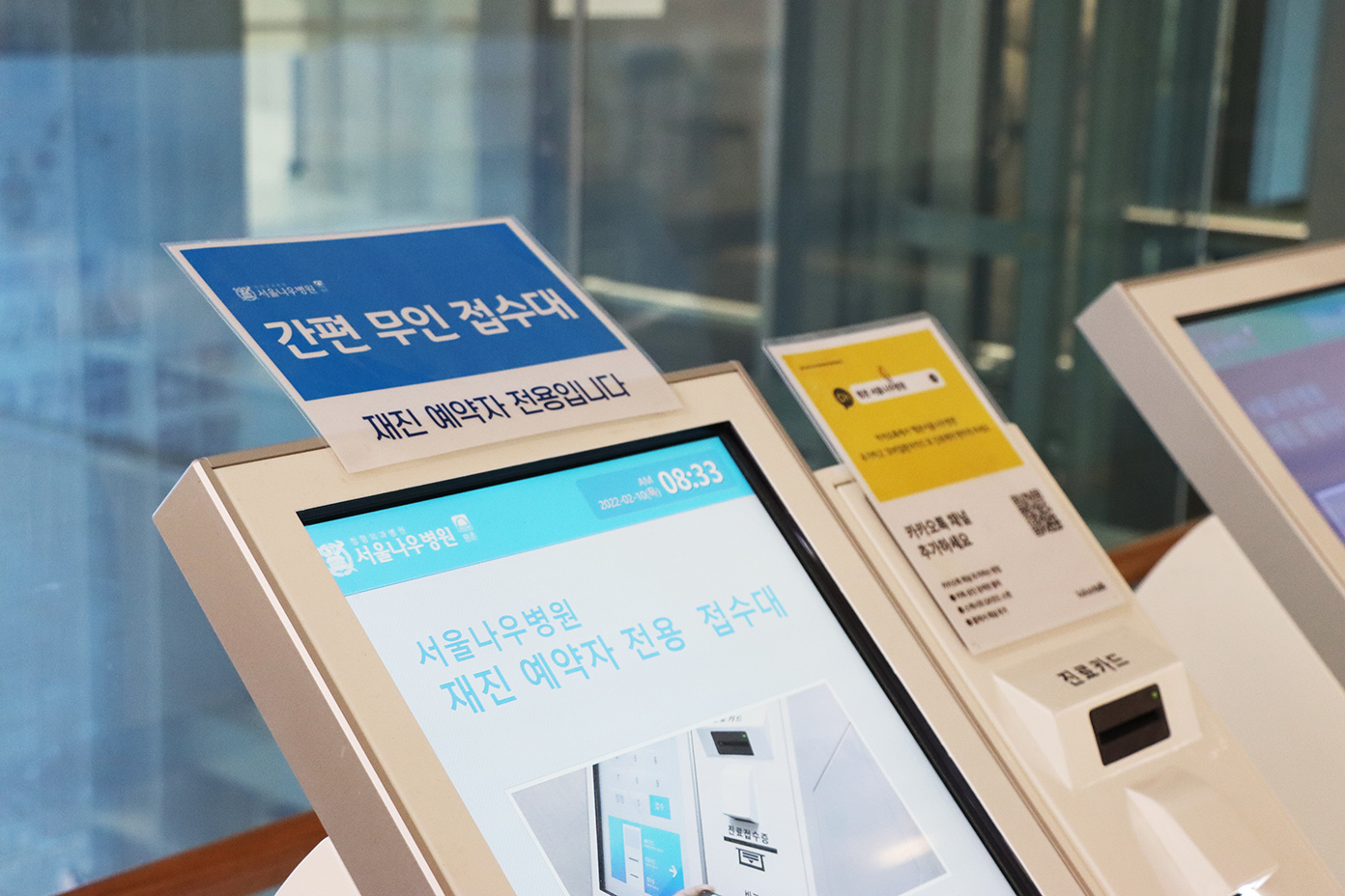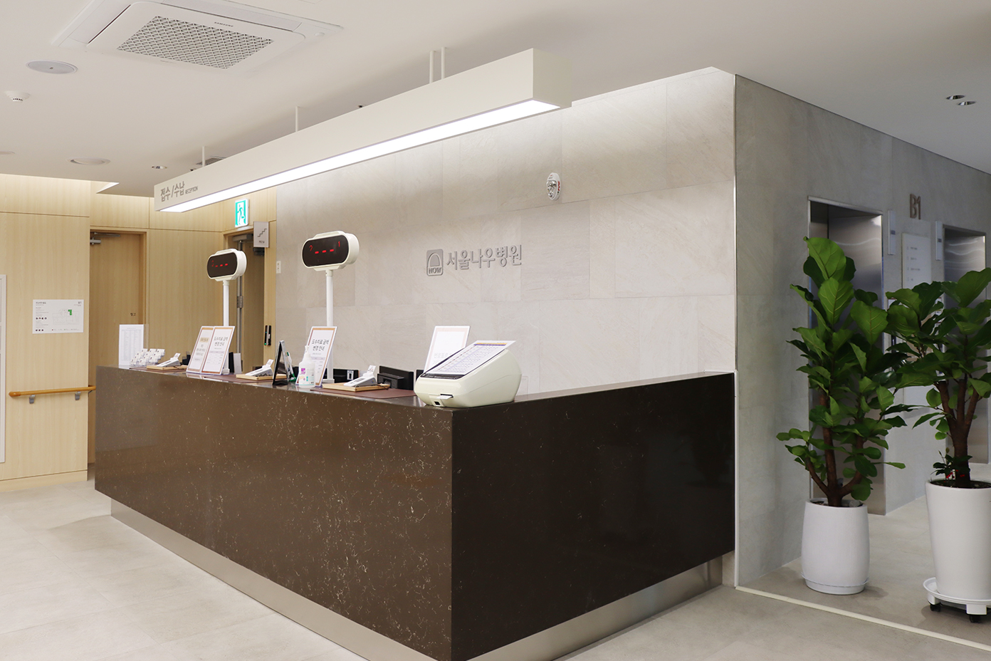 세 번째로, 환자 동선을 많이 감안한 누드엘리베이터를 설치했습니다. 이는 워크인으로 들어오는 환자이거나 1층 외래에서 접수하는 환자일 경우, 지하 1층(물리치료실과 혈액검사실), 1층(업무과), 2층(진단·검사하고 진료를 동시에 할 수 있게 구성) 등을 쉽게 오갈 수 있게 최대한 환자의 동선을 감안하여 누드엘리베이터를 설치했습니다. 특히 움직이면서 대형 스크린을 통해 환자에게 정보를 주고 싶었으나, 건축적인 면에서 전면에 유리를 뚫을 수 없다는 사실을 알게 됐습니다. 누드엘리베이터와 어우러지도록 전면을 유리로 마감했으면 좋았을 텐데, 허가가 나지 않아 너무나 아쉽습니다. 더욱이 전면 대형 스크린에 계절별로 힐링할 수 있는 동영상이나 예술품 큐레이터를 우리가 비용을 들여서라도 보여주고 싶었습니다. 이는 아프고 불편한 사람들에게 힐링할 수 있도록 해 주고,, 그런 환자를 대하는 직원들 역시 심리적인 안정감과 불만을 누그러뜨리자는 데 목적이 있었습니다. 아직까지는 병원 홍보 영상만 보여주고 있지만, 언제가 디지털 사이니지 효과를 톡톡히 누릴 수 있도록 할 계획입니다.