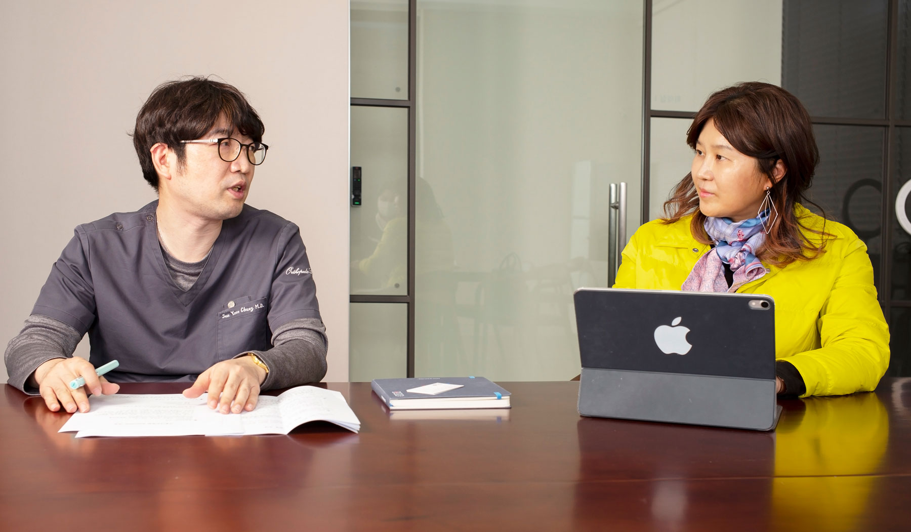 이상적인 공간을 실현하다! 정재윤 대표원장 이번에 개원 7주년을 맞아 신축 이전 개원한 서울나우병원은 홍익대학교 건축공학부 정재희 교수와 이안건설이 참여, 나우 이념의 상징성인 정직, 정통, 정확의 휴먼스케일을 병원 이미지에 부여했다. 건물 앞에는 앞서 언급한 어린아이부터 노인까지 생애 주기의 모습을 담은 조형물이 독보적으로 설치되었다. 이러한 설치물은 서울나우병원의 지향점을 효과적으로 표현해냄과 동시에, 삶의 순환과 연속성을 철학적으로 풀어낸 결과물로 보인다.. 이는 비단 진료와 치료로만 단정 지을 수 없으며, 기나긴 삶의 여정이자 시간성의 흔적이 담긴 작품이라 말할 수 있다. 내부 공간은 환자들의 심리적인 안정감과 최첨단 의료서비스의 강인함을 조화롭게 구현하여 따스하면서도 모던한 분위기가 동시에 전해진다. 특히 전체 베이스를 베이지 톤의 웜 그레이 컬러 배색으로 편안하게 조성했으며, 브라운톤의 석재, 목재, 알루미늄, 타공 패널, 유리 등의 재료로 전체 공간을 풍요롭게 감싸 안았다. 또한 공용 부위의 멀티미디어 공간은 발색 금속을 적용하여 환자들에게 최첨단 의료 서비스를 제공하면서, 또 환자 자신에게도 특별한 의료 서비스를 제공받는 느낌을 동시에 안겨주고 있다. 그만큼 전체 과도한 장식과 컬러는 배재한 채 온화한 분위기 속에서 누리는 효율적이고 위생적인 의료서비스 제공에 초점을 맞추었다. 이번 공간에서 눈여겨볼 부분은 1층 체험존으로, 스마트 태블릿(smart tablet)과 셀프 체크존(self-check zone)이 설치되었다. 태블릿 PC 안에는 서울나우병원이 제작한 질환별 운동법, 질환별 건강관리법이 담겨 있으며, 셀프존의 경우 줄자를 이용해 환자들이 직접 근력량을 체험하도록 한 점이 눈에 띈다. 또한 환자의 동선을 감안한 누드엘리베이터와 전면 대형 스크린을 통한 정보 제공으로 스마트한 병원 이미지를 각인시켰다. 더욱이 6층은 환자와 직원들의 휴식과 쉼을 위한 하늘 정원, 사색의 정원, 치유의 중정, 선큰가든이 설치되었으며, 3층 수술실 경우 천정에 푸른색 스크린을 설치했다. 이는 수술실에 들어가는 환자가 불안해하지 않도록 심신의 안정감을 주고자 설치한 것으로, 천장에 푸른색 하늘이 비치도록 연출한 점이 인상 깊다. 정재윤 대표원장은 이번 병원 설계에 대해 “나우의 상징성인 문화와 의료, 커뮤니티와 웰니스가 융합된 이상적인 공간으로 진행했습니다”라고 설명했다.  서울나우병원  1층 휴식공간 7. 이번에 서울나우병원이 올해 지하 5층에서 지상 7층, 연면적 8317㎡ 규모의 건물로 신축 이전 개원했습니다. 이전하게 된 배경과 설계 컨셉 방향 대해 한 말씀 부탁드립니다. 서울나우병원은 홍익대학교 건축공학부 정재희 교수님과 이안건설이 참여했습니다. 정재희 교수님은 기획설계부터 실시설계까지 건축과 인테리어 전반에 걸쳐 통합 설계를 진행했으며, 시공 전반에 걸쳐 재료 선정과 디테일 결정 등 디자인 감리까지 겸한 전체 PM(프로젝트 매니저)으로 임무를 수행했습니다. 처음 설계 방향은 정제된 디자인, 환자 경험을 살릴 수 있는 디자인을 삽입하는 게 목표였습니다. 전체 컨셉은 ‘첫인상이 모든 것을 좌우한다!’를 기본으로, 나우 이념의 상징성인 정직, 정통, 정확의 휴먼스케일을 병원 이미지에 부여하도록 했습니다. 또한 환자를 최우선으로 생각하는 나우병원의 친근한 이미지와 새로운 브랜드 ‘아이덴티티’로 경쟁력 강화에 중점을 뒀습니다. 이 밖에 내부 공간의 조닝을 반영한 입면을 구성했으며, 브라운 톤의 석재, 목재, 알루미늄, 타공 패널, 유리 등 다양한 재료 사용으로 따뜻하면서도 모던한 병원의 이미지를 강조했습니다. 더욱이 야간에도 환한 병원이라는 이미지 구축을 위해 타공 패널 후면에 LED조명을 설치한 점이 특징입니다. 내부 마감재 경우, 내원하는 환자들의 심리적인 안정감을 위해 베이지 톤의 웜 그레이(warm grey) 컬러 배색을 기준으로 적용했습니다. 또한 유지관리의 내구성을 고려하여 포세린 타일을 공용부위 바닥 및 벽체에 적용했으며, 이동식 가구 및 진료실 도어에 포인트 컬러를 저채도 원색으로 적용해 편안하면서도 경쾌한 이미지의 공간감을 형성해냈습니다. 공용부위의 멀티미디어 공간은 발색 금속을 적용하여 환자들에게 최첨단 의료 서비스를 제공하면서, 또 환자 자신에게도 특별한 의료 서비스를 제공받는 느낌을 동시에 안겨주도록 했습니다. 입원실의 간호사 데스크 및 입원병동의 바닥, 벽 마감은 인조대리석과 의료용 비닐 시트를 사용하여 과도한 장식은 배재하면서 효율적이고 위생적인 의료서비스 제공에 초점을 맞추었습니다. 더욱이 기본 매입등과 간접등박스를 적용해 실용성을 높였으며, 최소한의 공사비로 이용객 및 환자들에게 기능적 조도 외에 편안하고 아늑한 조명 설계를 진행했습니다.  병원에 설치된 생애주기를 담은 조형물 8. 또한 이전하면서 가장 크게 변화를 준 공간이나 디자인이 있다면 소개해주세요. 먼저는 앞서 언급했던 건물 앞 생애주기의 모습을 담은 조형물입니다. 우리들은 원시인 모형이라고 부르는데, 신생아부터 노인에 이르기
