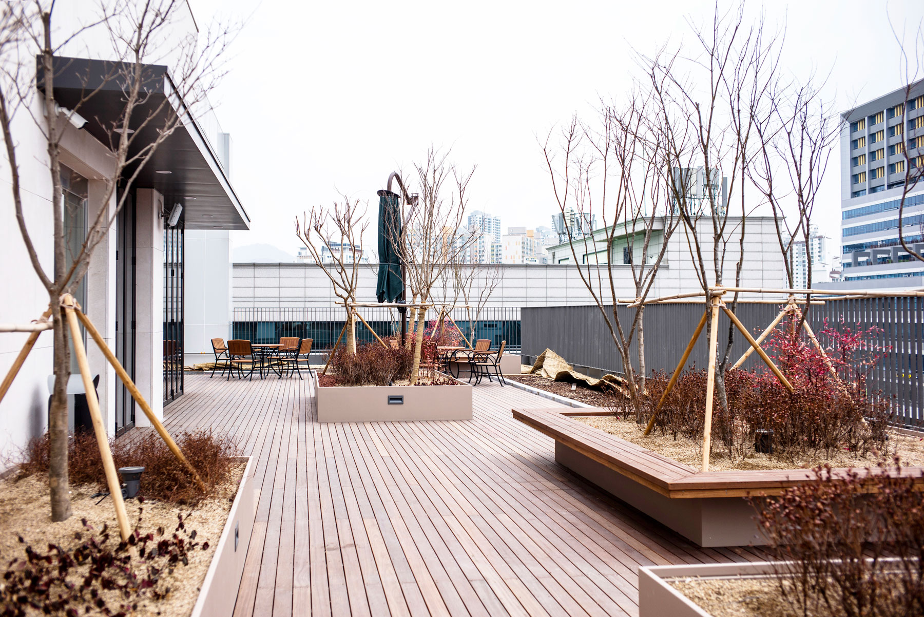 또한 앞서 언급했듯, 6층에 회의실을 개방했습니다. 그래서 식사 후 외부 테라스에 앉아서 차를 마시거나 쉴 수 있게 꾸몄습니다. 의자 배치를 좀 넓게 한 것은 블루투스 스피커를 놔두고 본인이 듣고 싶은 음악을 편하게 들을 수 있도록 하기 위함입니다. 그래서 일부러 가변형 벽체로 방 두 개를 나눠서 사용할 수 있게 했습니다. 문도 양쪽에 배치되어 각각 따로 회의하거나 휴식을 취할 수 있습니다.