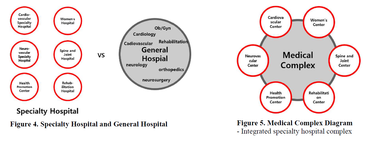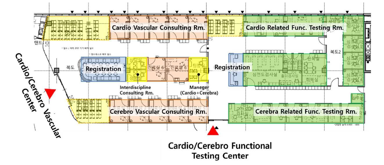 의료복합체 평면구성 의료복합체로서의 공간디자인은 선례가 없던 만큼 많은 고민을 하였고, 각 전문병원의 효율성과 아이덴티티를 그대로 가져오면서도 하나의 병원처럼 통일감 있는 경험을 설계하는 것에 중점을 두었다. 먼저 로비 및 아트리움에서 시작되는 주 동선에 따라 공통된 포털디자인을 통해 환자들의 경험을 통일하고 센터 입구인 포털 이후의 진료실, 검사실 등의 레이아웃은 각 전문병원의 진료 프로세스에 따라 적용함으로써 효율성과 전문성을 높일 수 있도록 하였다.