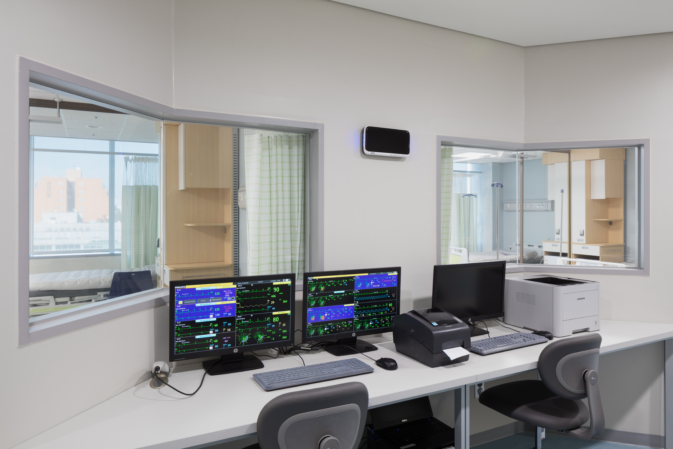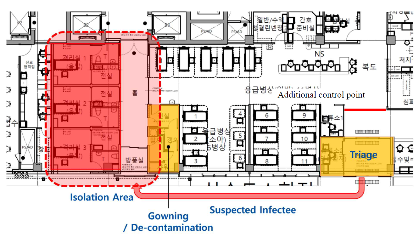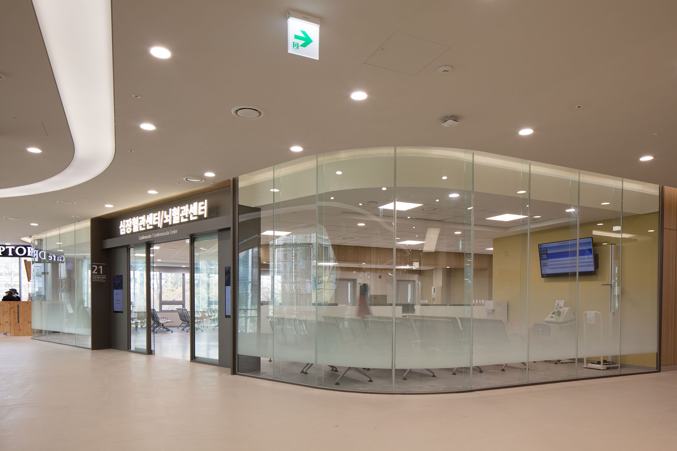 의료시설 계획 의료공간의 세부적인 계획에 있어서는 환자안전과 감염관리 측면을 최우선적으로 고려하여 최선의 의료공간을 목표로 디자인되었다. 메르스 초기 감염병 대응을 위해 선제적으로 응급센터 및 병동에 각각 별도의 격리구역과 출입통제구역을 마련하였고 원내 모든 구역에서 청결구역과 오염구역의 명확한 동선분리가 가능하도록 계획하여 One-Way Process를 실현하였다. 이는 현재 장기화되고 있는 코로나 사태에도 지역 안심병원으로써 유효하게 대응할 수 있는 기반이 되었다.