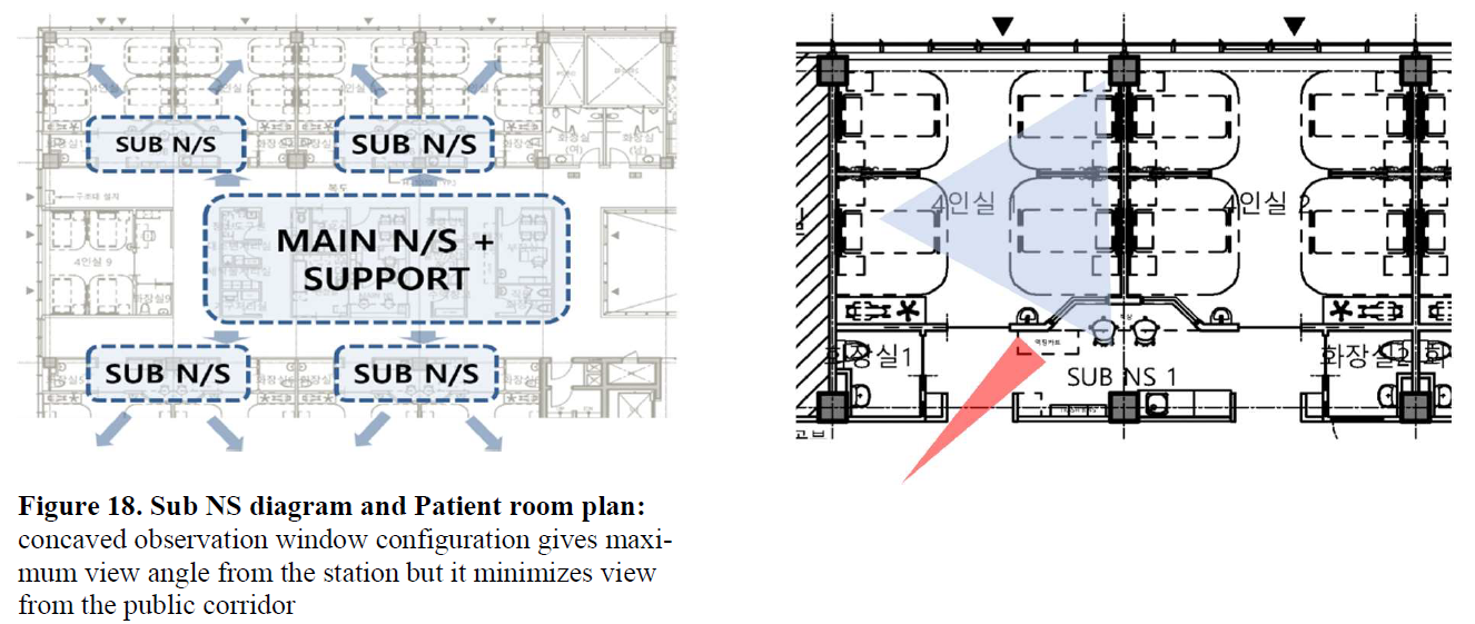 병동 구성 병원이 설계될 당시에는 간호간병 통합서비스를 시범사업을 진행 중이었고, 시범사업에 참여한 인천세종병원은 간호간병 통합서비스를 적용하기에 유연성이 떨어지는 종래의 중앙집중형 간호스테이션을 벗어나는 새로운 모델이 필요하였다. 인천세종병원은 국내 최초로 병실 2개마다 SUB NS를 구성하여 전 병동에 적용함으로써 환자중심의 쾌적하고 안락한 치유환경을 조성하였으며, 중정을 중심으로 설계된 휴게실과 출입통제 시스템은 나아가 감염을 예방하고, 병문안 문화를 개선할 수 있는 선진적 병원을 계획하였다. 또한 전체 입원병동의 기준병실은 4인실로 구성하였고, 모든 입원실 및 중환자실의 병상 사이마다 유리 벽을 계획하여 최상의 안전과 치유환경을 제공할 수 있도록 하였다.