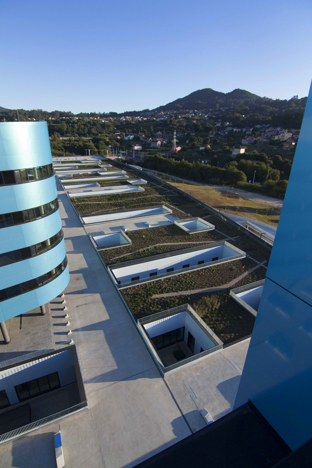 Vigo시의 외곽 구릉지에 위치한 병원은 대지의 경사가 갖는 특징을 살려 이용객과 환자가 어떤 위치에서도 풍경을 둘러볼 수 있도록 설계되었다. 그곳에 나란히 앉혀진 6개의 거대한 병동은 끝으로 갈수록 좁아지는 형상으로 돌출되었으며, 덕분에 자연과 접하는 면적을 최대화하여 햇빛을 실내 깊숙이 끌어들일 수 있게 되었다.외래진료센터 위로 설치된 옥상정원은 이용자에게 휴식과 치유의 공간이 될 뿐만 아니라 뜨거운 스페인 햇빛으로부터 실내온도를 유지하는 기능을 담당한다.