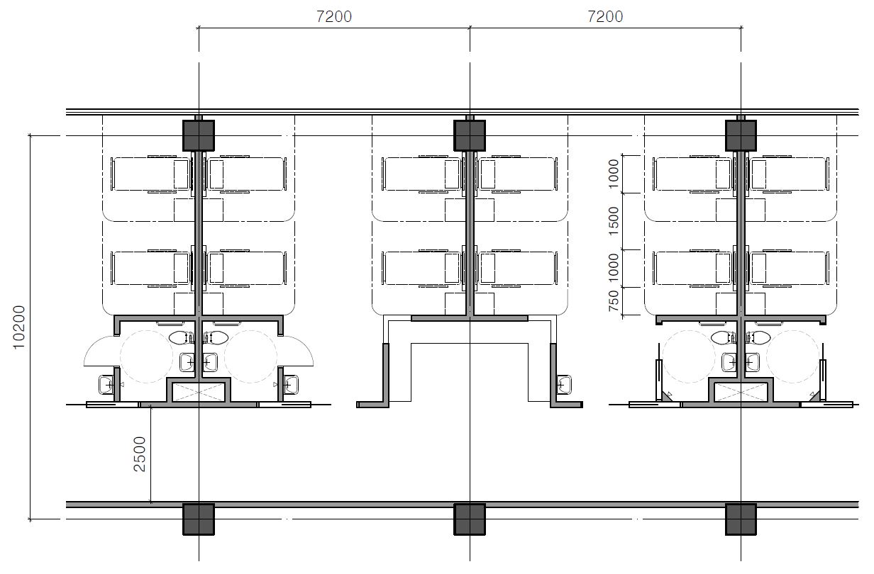 7.2m 모듈의 4인실 레이아웃 예 그런 측면에서, 2인실은 여전히 계륵입니다. 2인실은 기본적으로 프라이버시면에서는 4인실과 동일합니다. 즉 없습니다. 또한 외국의 연구사례를 보면 2인실은 환자 만족도에 있어서도 4인실보다 떨어진다고 합니다. 우리나라의 상황도 거의 비슷한데, 4인실에 비해 2인실에서 옆 환자에 대한 컴플레인이 훨씬 더 많다고 들었습니다.
