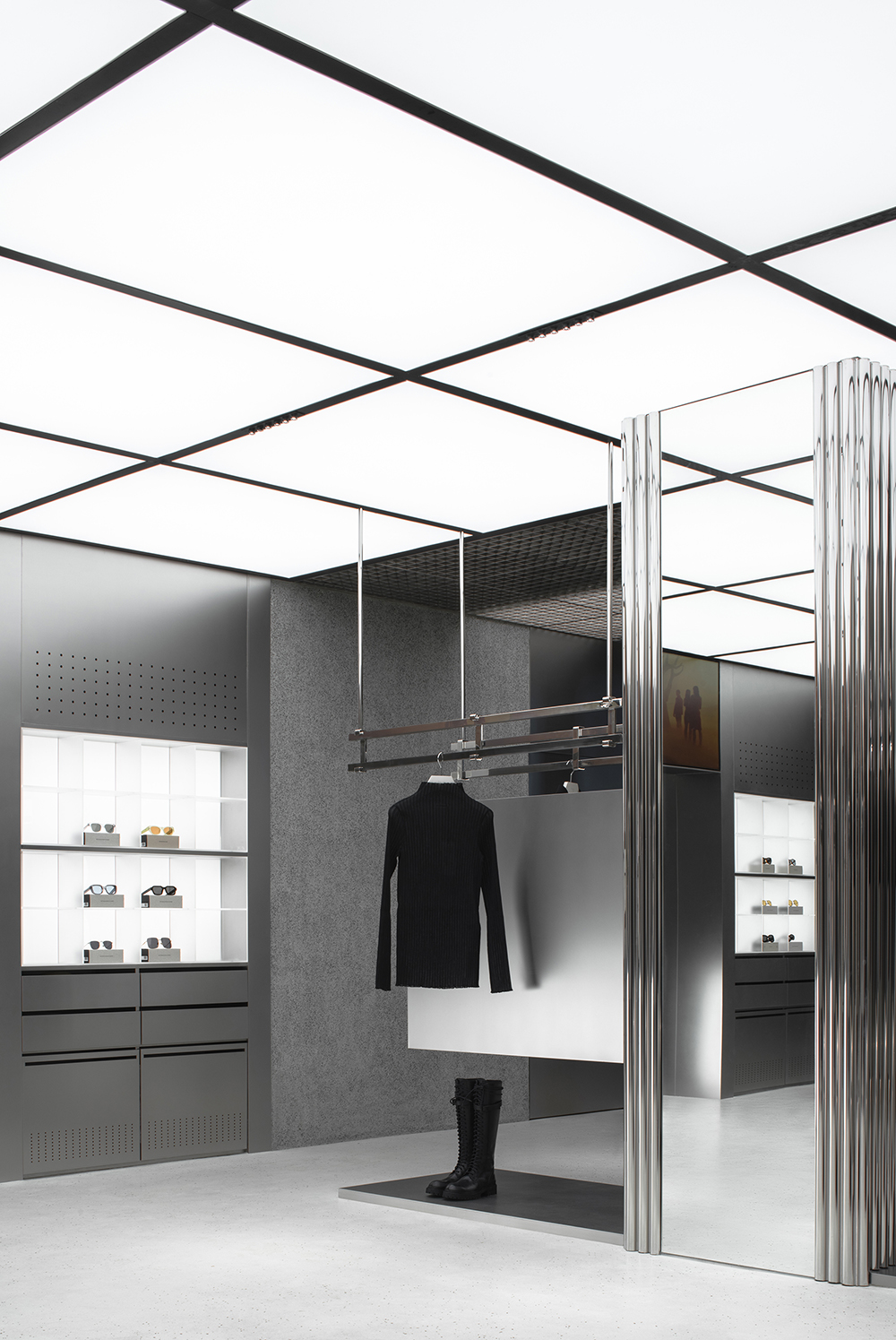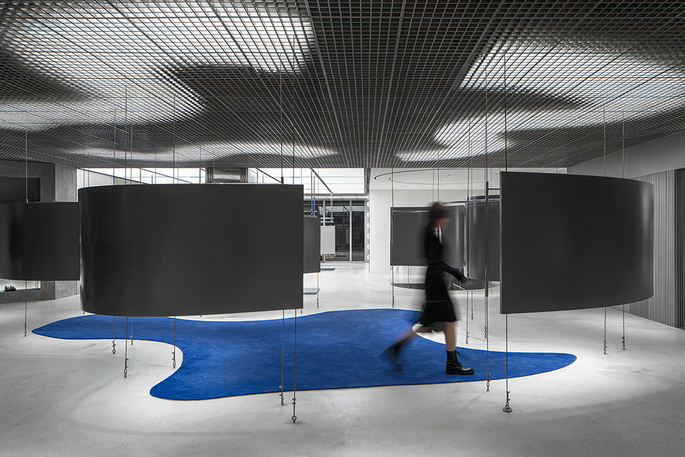 시간과 공간의 개념은 이곳에서 감각의 충돌과 교차에 다차원적 표현이 더해져 독특한 언어 체계를 부여한다. 특히 원형 및 선형 스테인리스 레일 전시 프레임이 전체 공간을 질서정연하게 연결하는 시각적 선으로 작용한다. 이에 더해 일부에 적용된 곡면 요소가 스테인리스의 은색으로 인해 풍기는 냉기를 어느 정도 중화시키고, 브랜드의 블루컬러와 맞물려 미래적인 모습과 개척 의지를 보여준다.