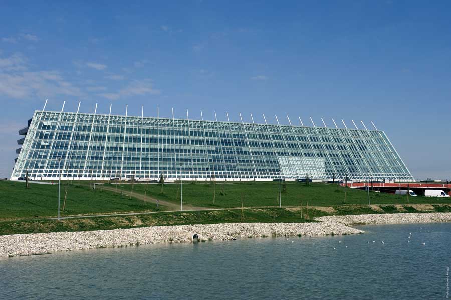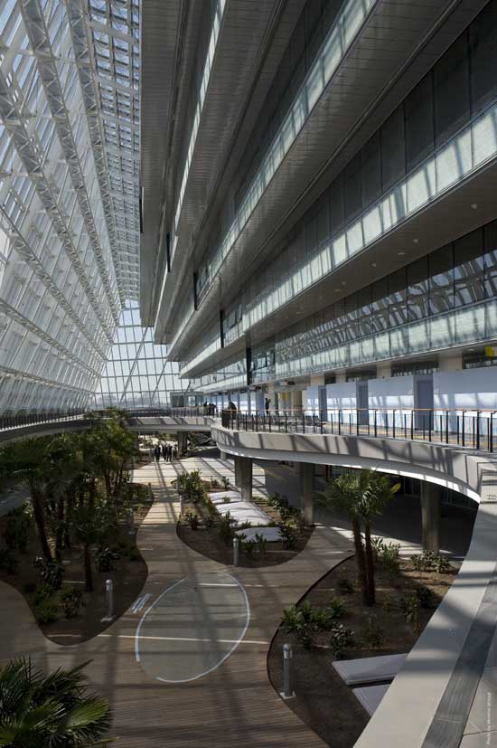 플랫폼 구역과 입원 환자 구역을 연결하는 것은 건물과 같은 높이의 큰 돛 모양 유리 구조물로, 병원 내 모든 시설과 연결된 넓고 밝은 현관홀을 덮고 있다. 건물 전면 전체 길이를 따라 이어지는 광범위한 유리 표면은 인근 철도의 소음을 걸러낸다. 더불어 북동면에 테라스를 형성하여 개별 병실의 품격을 높이고 남서면에 돌출된 바닥에 의해 생성되는 그림자를 이용하여 직사광선의 영향을 현저히 감소시켰으며, 녹지로 덮인 병원의 기술 서비스 구역을 입원 환자 구역과 연결하여 편리함을 개선했다.