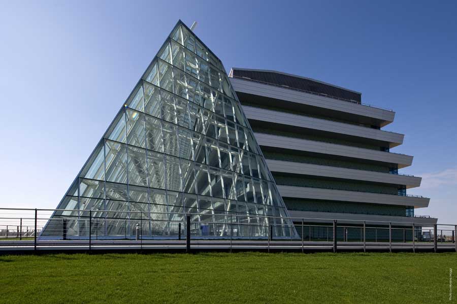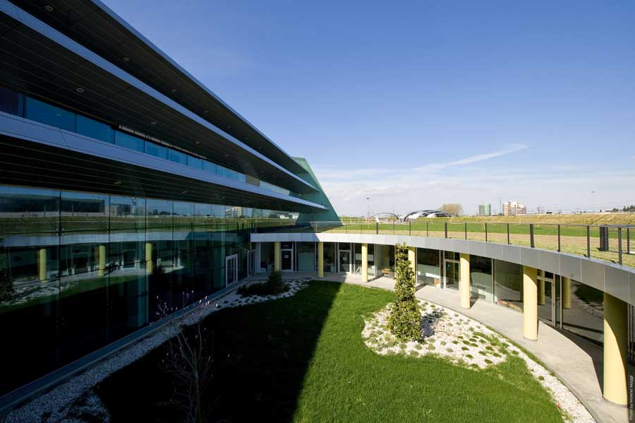 겨울 정원 New Mestre Hospital의 진입 시퀀스에 따라 방문객이 녹색 지붕으로 덮인 지형(실제 풍경)으로 들어가면, 비스듬한 유리 파사드로 덮이고 겨울 정원으로 강화된 커다란 현관홀(재창조된 풍경)로 나오게 된다.