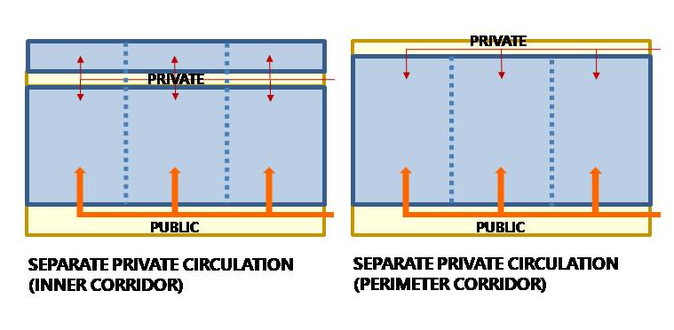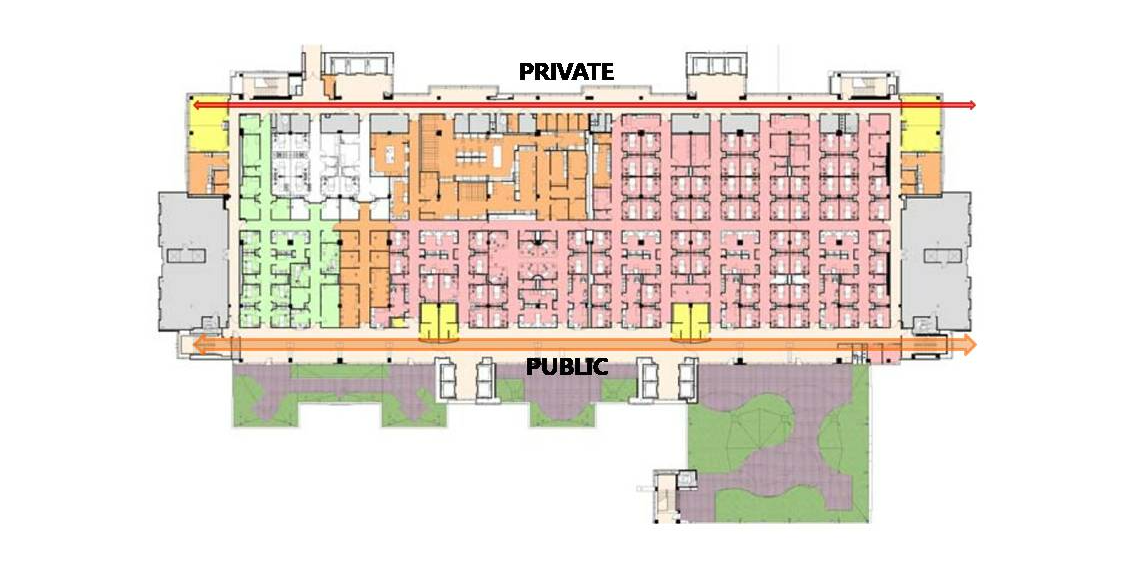 보시다시피 이 건물은 도면 아래쪽의 공용복도(public corridor)와 반대편 외주부 쪽에 직원 복도(private corridor)가 설치되어 있습니다. 이처럼 공용복도는 물론 직원 복도까지 창가에 면해 있다는 점이 신선했습니다.