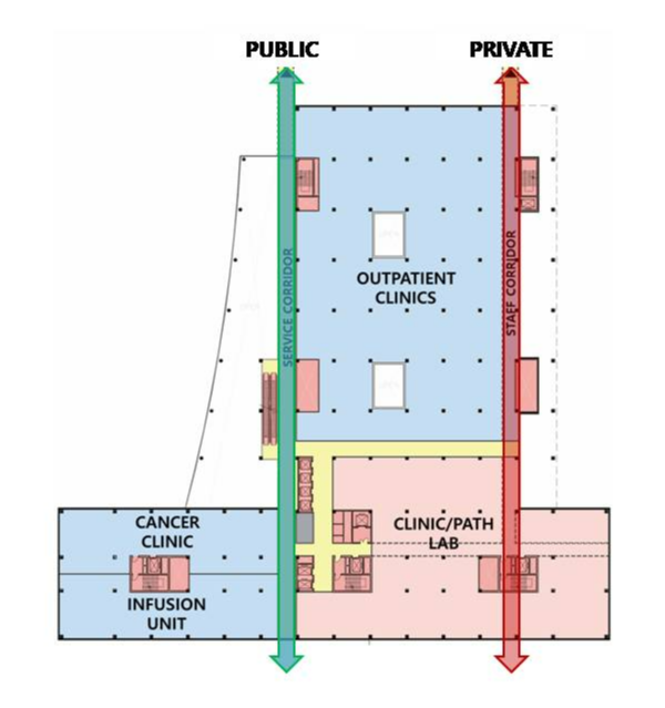 위 평면은 제가 곧바로 수행했던 콜롬비아국립대병원의 기획설계안입니다. Public(내원객) 동선과, Private(의료진/물류/입원환자)의 동선이 명확하게 분리되어 있습니다. 그리고 이 복도들은 각각 아트리움과 외부로부터 자연채광을 받도록 하고 있습니다. 아쉽게도 프로젝트는 실현되지 못했지만, 이후 우리 회사 병원설계팀에서 사용하는 동선체계 프로토 타입 중 하나로서 정립되는 계기가 되었습니다.